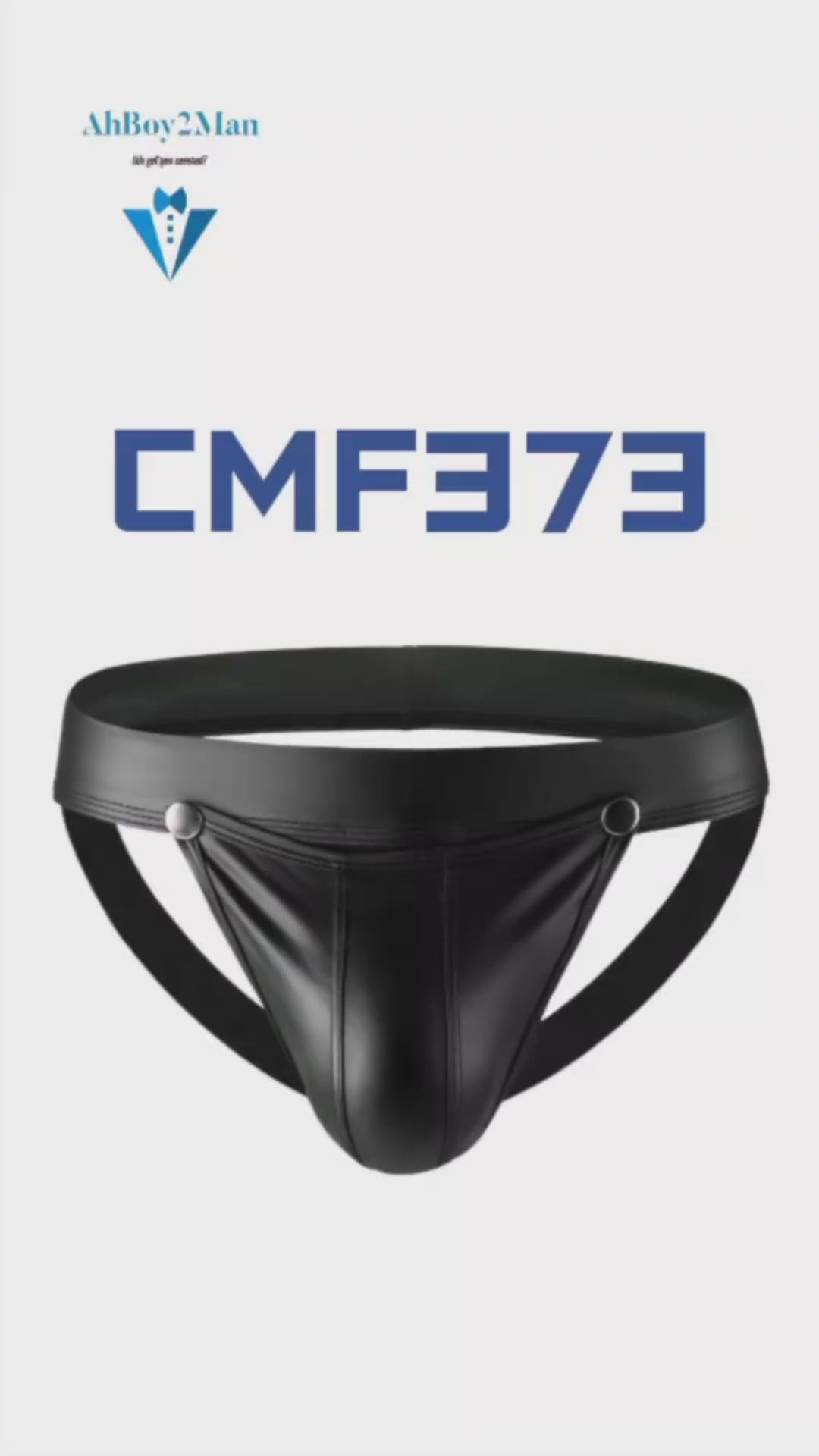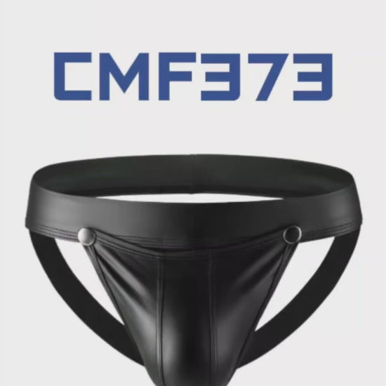 Made of polyester. Faux leather jockstrap. Removable large 3D pouch (top portion). 3.8cm faux leather waistband, 2.5cm spandex thigh band.