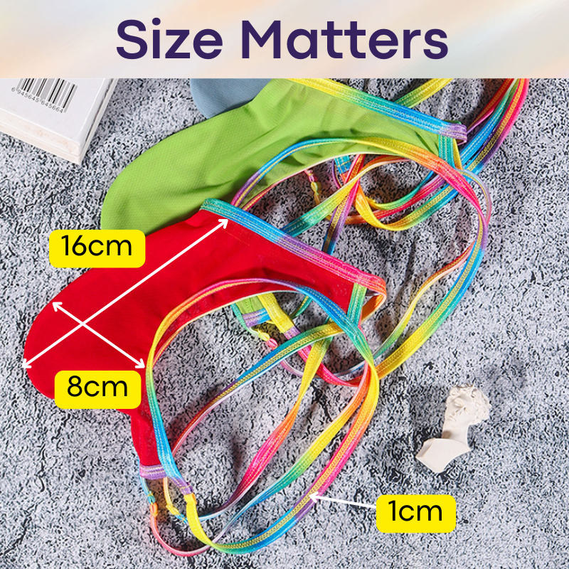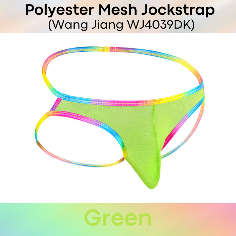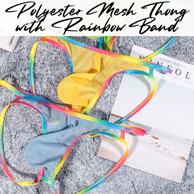 Made of polyester. Mesh see through. Rainbow string band, 1cm wide. Protruding 3D pouch design, great for down parkers.