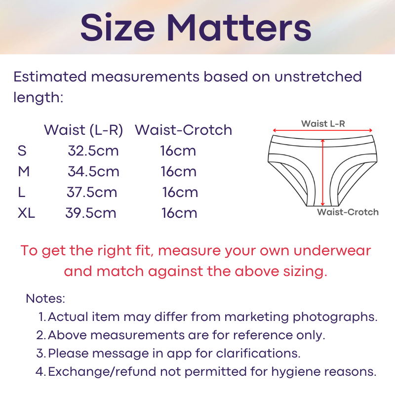 Please refer to seller' estimated measurements before placing order. There is no exchange/refund if sizing is wrong. To get the right measurement, measure with your underwear flat, from left to right of waistband. Thereafter, check against the size chart in this listing for the closer match. This is a general guideline, and does not factor in certain body shapes (thigh, bum etc) and elasticity of the waistband. Every brand/model varies in sizing measurements.