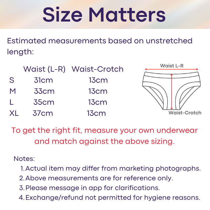 Please refer to seller' estimated measurements before placing order. There is no exchange/refund if sizing is wrong. To get the right measurement, measure with your underwear flat, from left to right of waistband. Thereafter, check against the size chart in this listing for the closer match. This is a general guideline, and does not factor in certain body shapes (thigh, bum etc) and elasticity of the waistband. Every brand/model varies in sizing measurements.