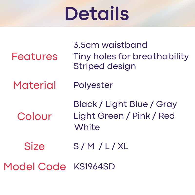 Made of polyester. Striped design. Tiny perforated material, with high breathability. Soft and thin polyester. 3.5cm waistband, with 1.5cm thigh band strap. Comfortable to wear for any occasion.
