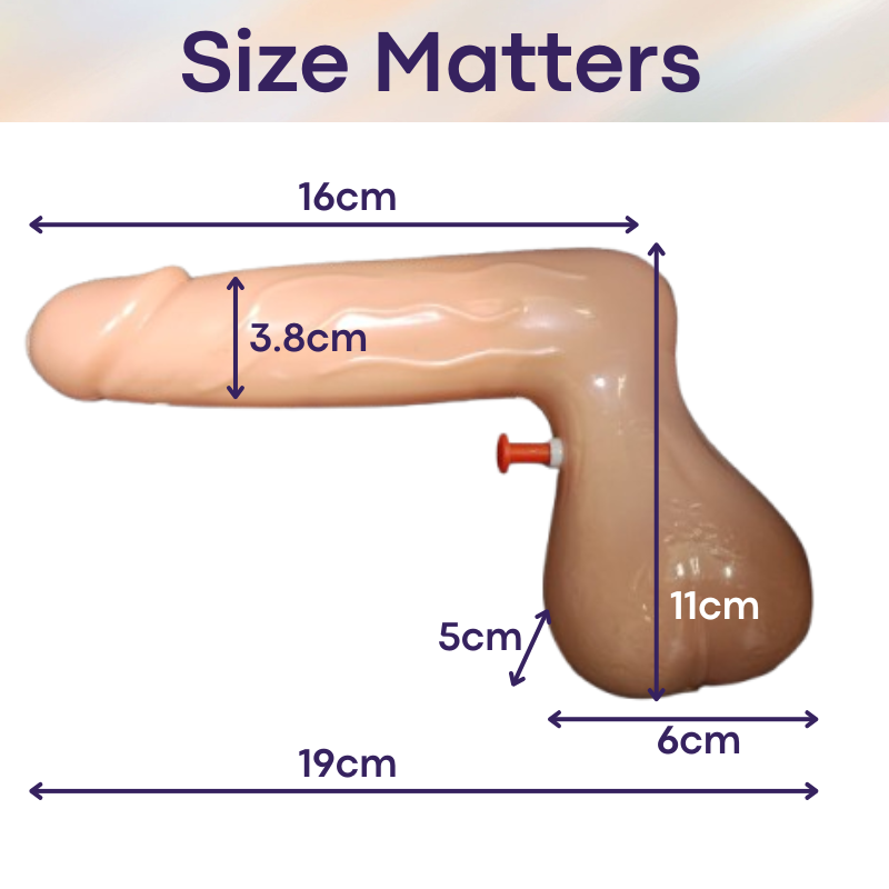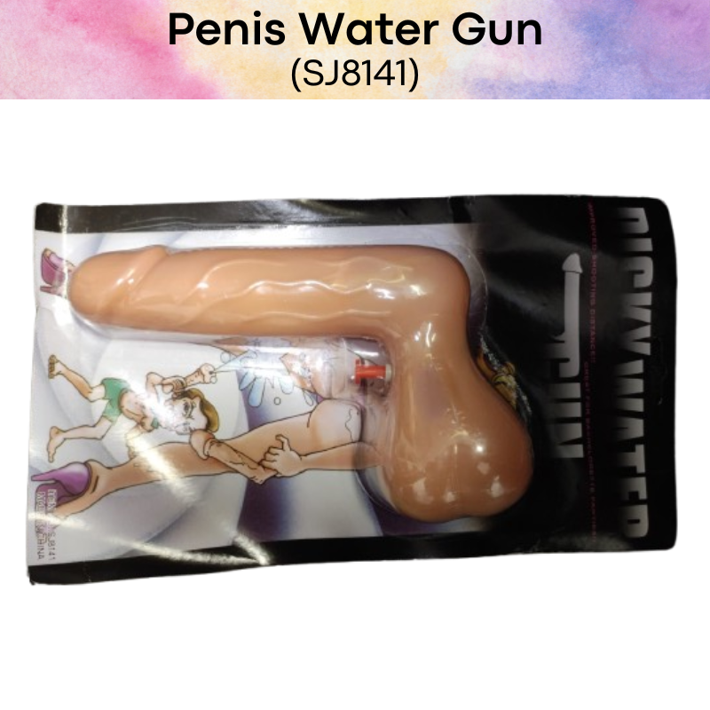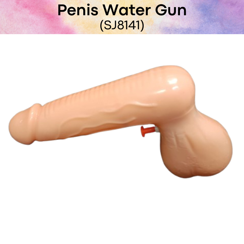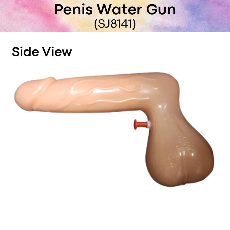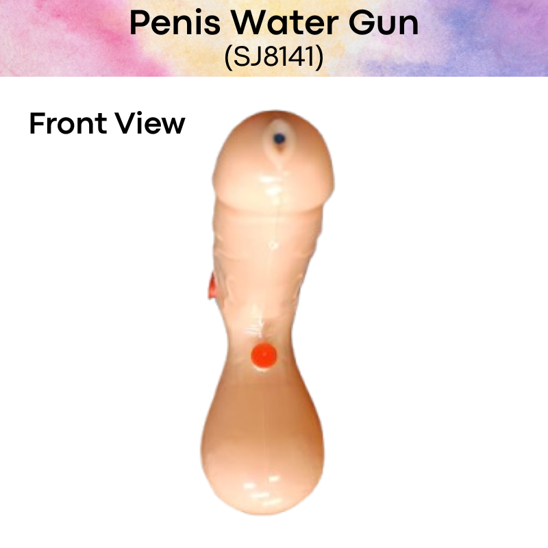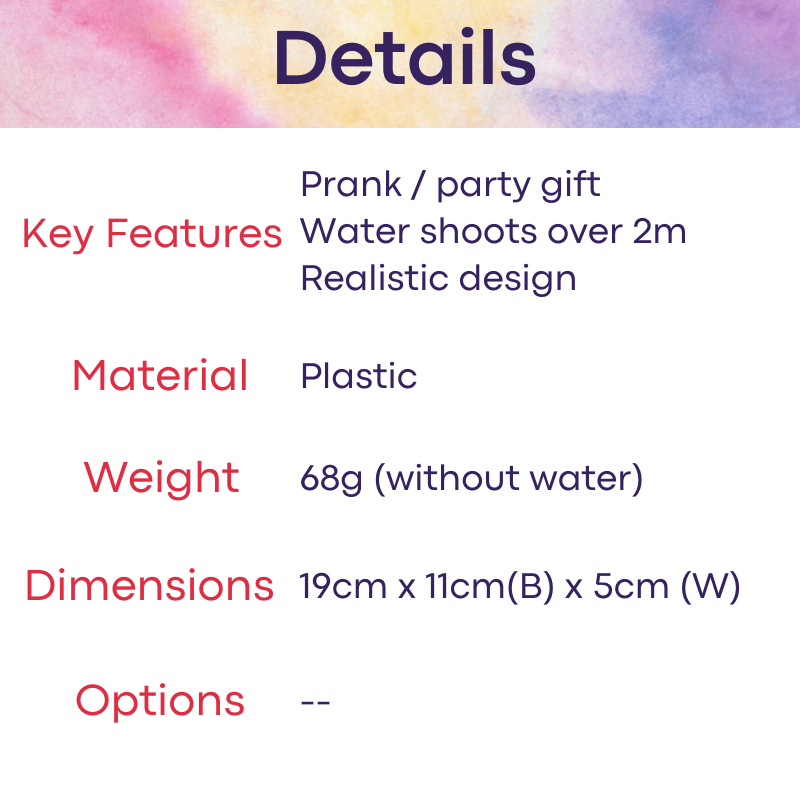 Made of plastic. Penis shape design water gun, with scrotum as handle. Water can shoot over 2m. Fun party/prank gift, great for bachelor / bachelorette party.