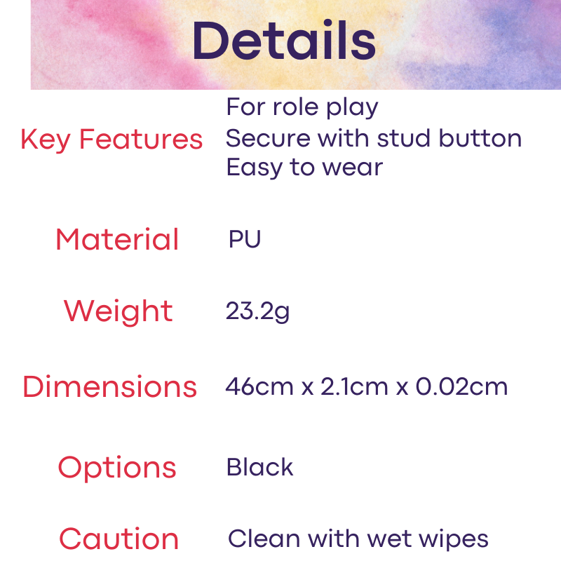 Made of PU. Adjustable choker with stud button. Glittery "Slave" embellishment. Unisex, for male or female roleplay.