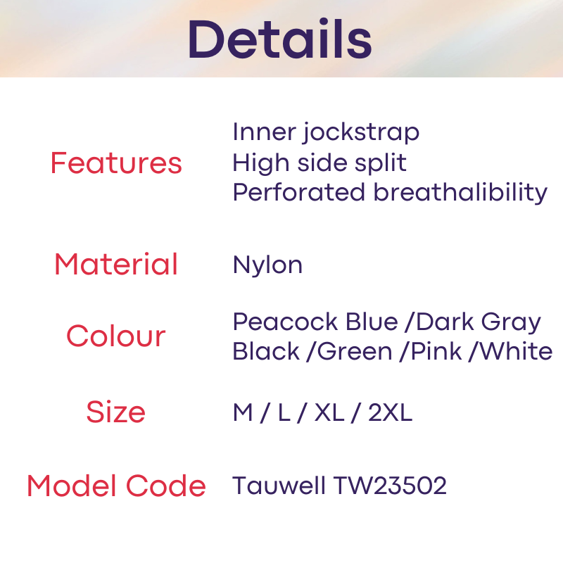 Made of nylon. Perforated for great breathability. High split sides with minimal restriction during intense exercises. Inner jockstrap for greater freedom.