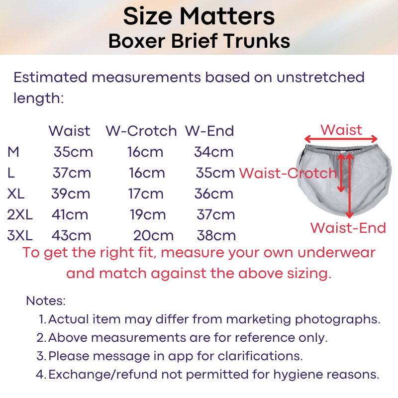 Please refer to seller' estimated measurements before placing order. There is no exchange/refund if sizing is wrong. To get the right measurement, measure with your underwear flat, from left to right of waistband. Thereafter, check against the size chart in this listing for the closer match. This is a general guideline, and does not factor in certain body shapes (thigh, bum etc) and elasticity of the waistband. Every brand/model varies in sizing measurements.