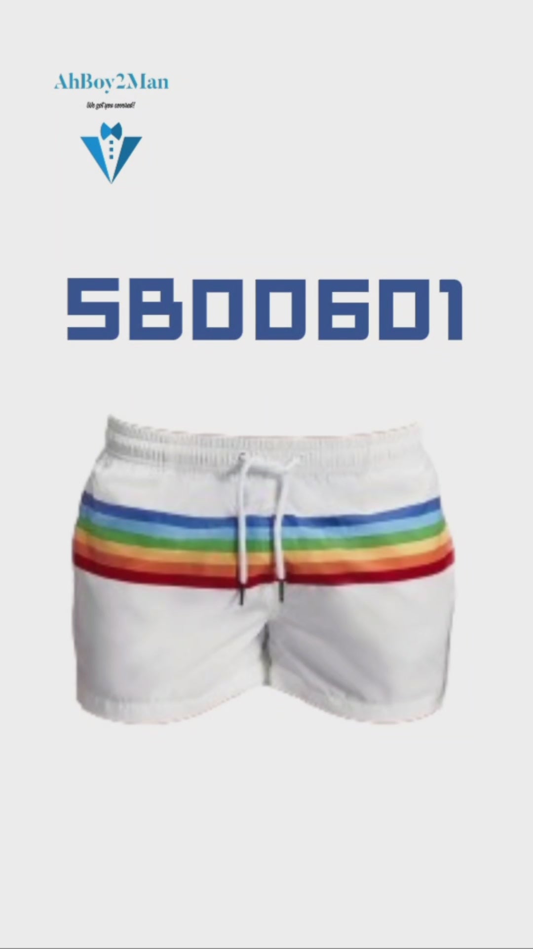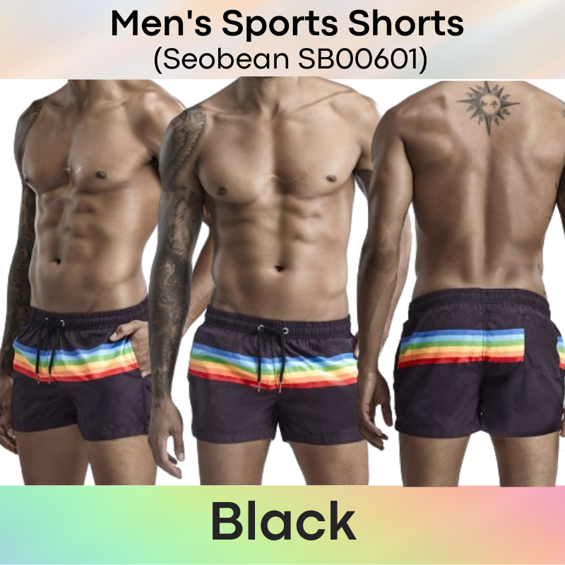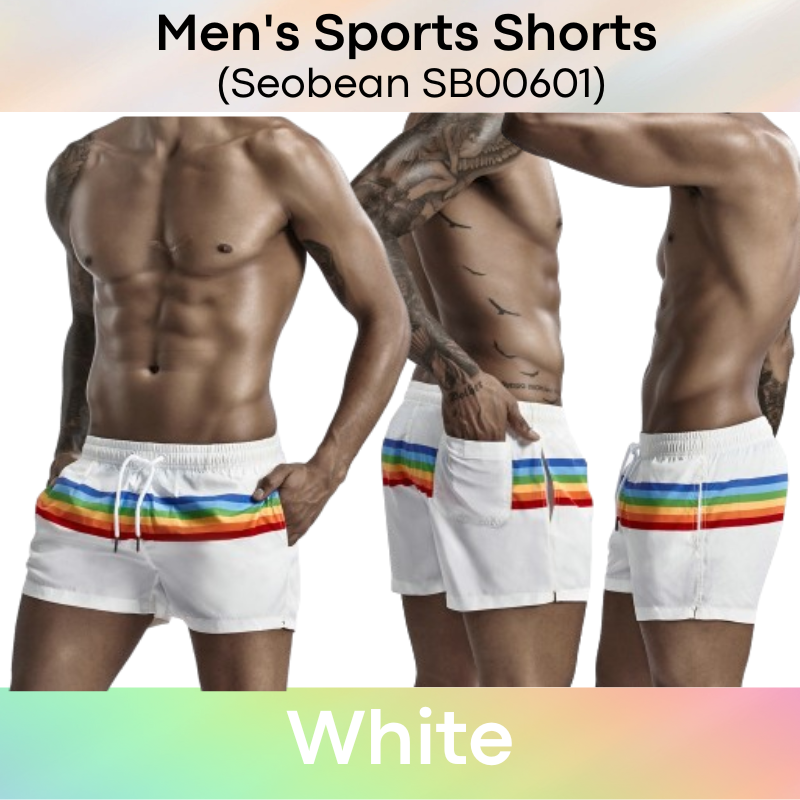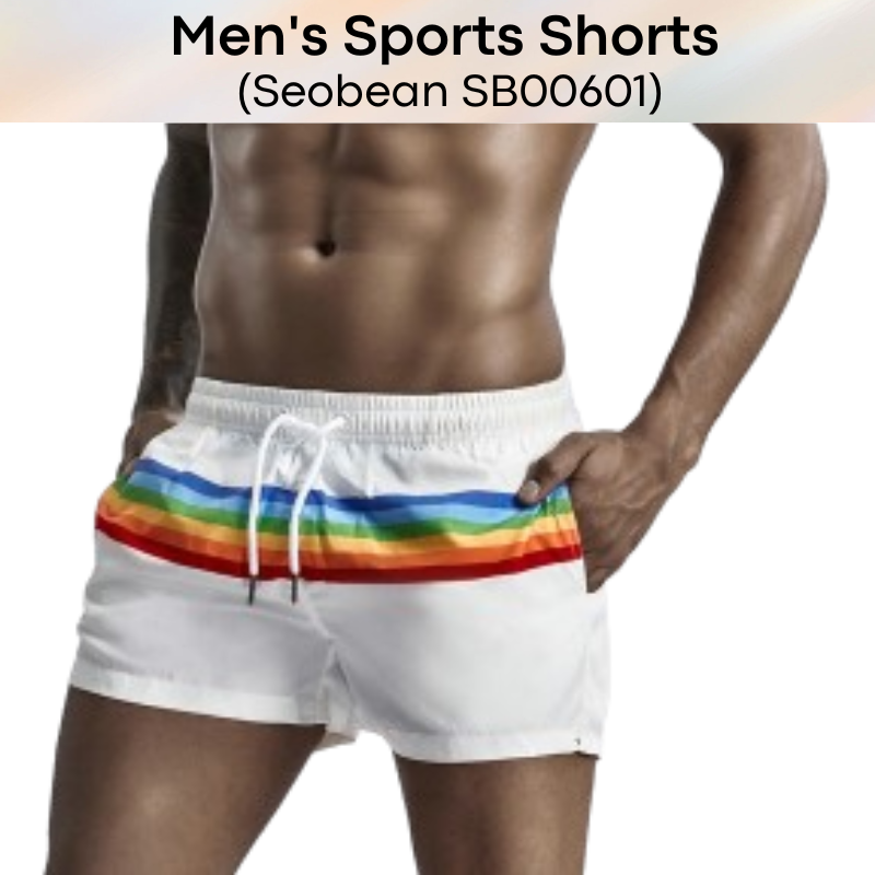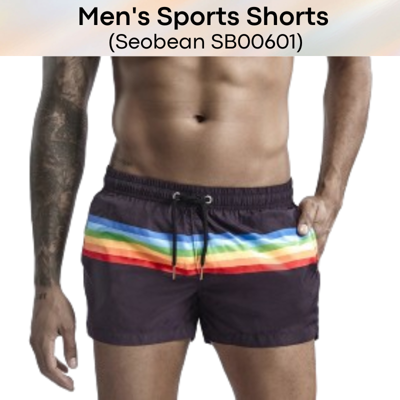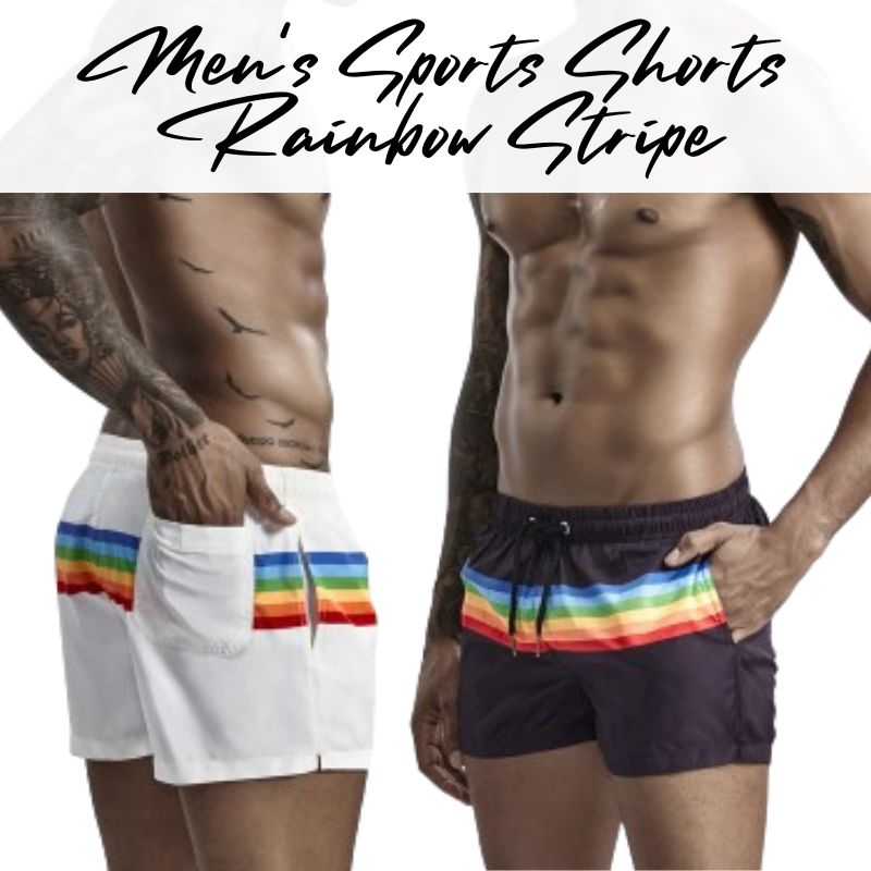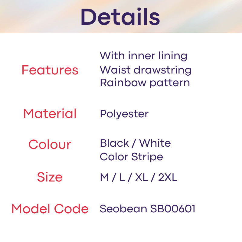 Made of polyester. Waist drawstring shorts with inner lining. Great for sports, home and beach. Rainbow stripe pattern. Rear back pocket with velcro.