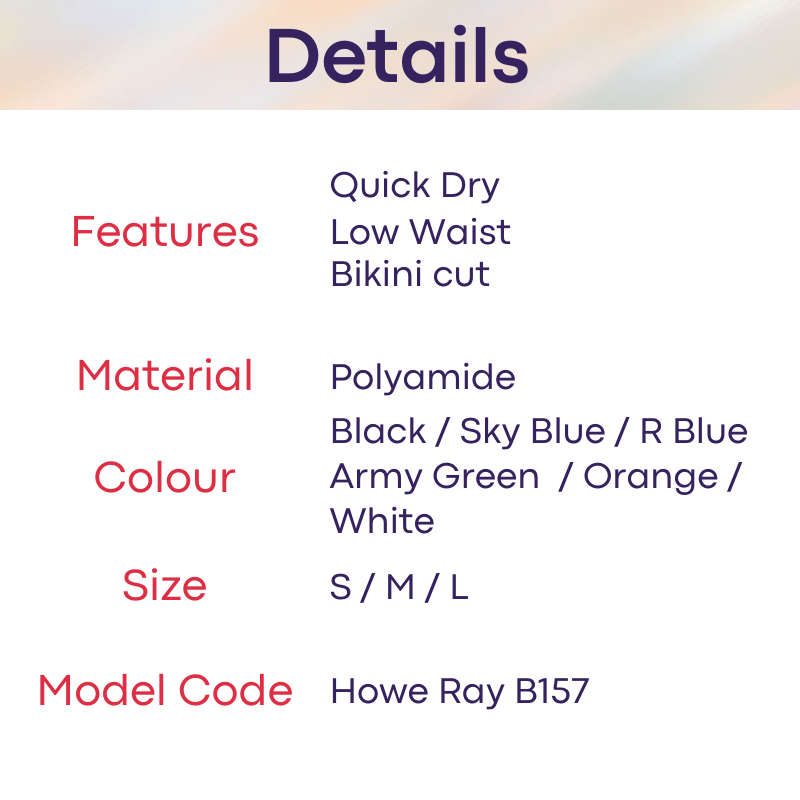 Made of polyamide. Bikini cut without any string tie. Quick dry for your next swim/tan session. Variety of colors to suit your mood.
