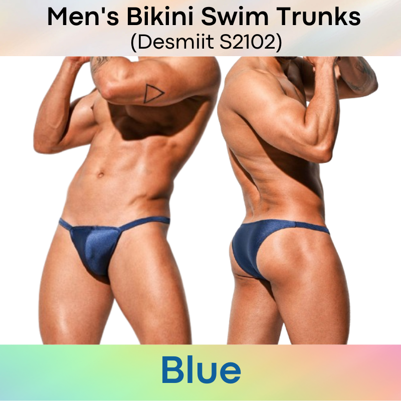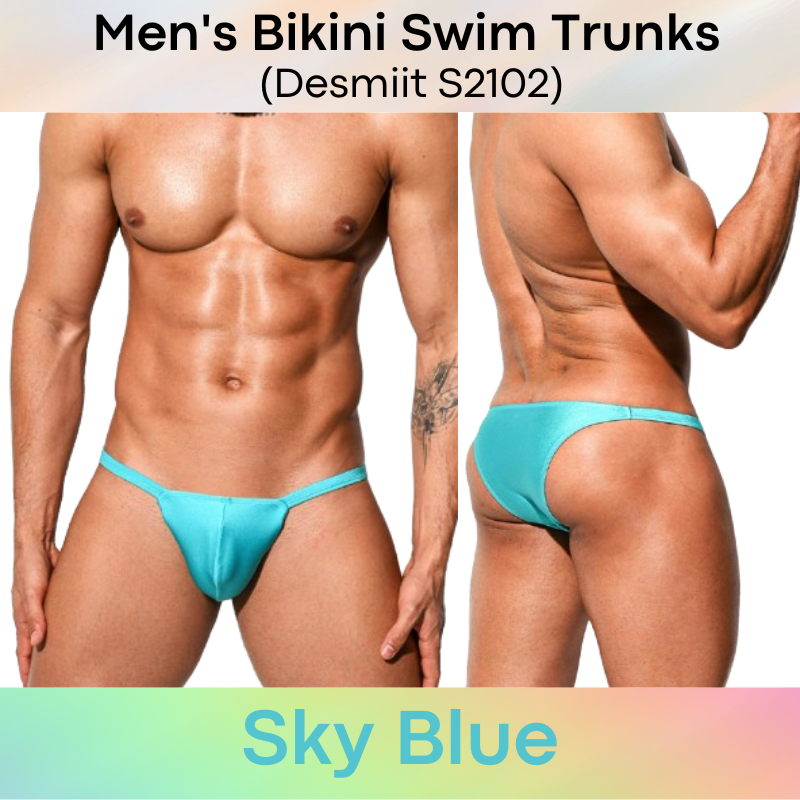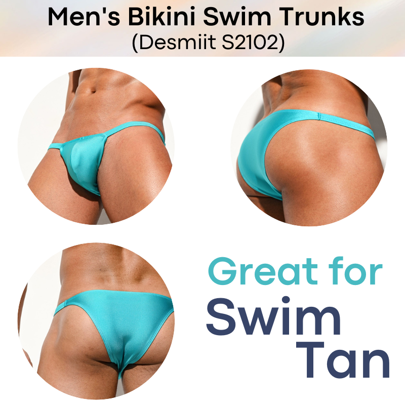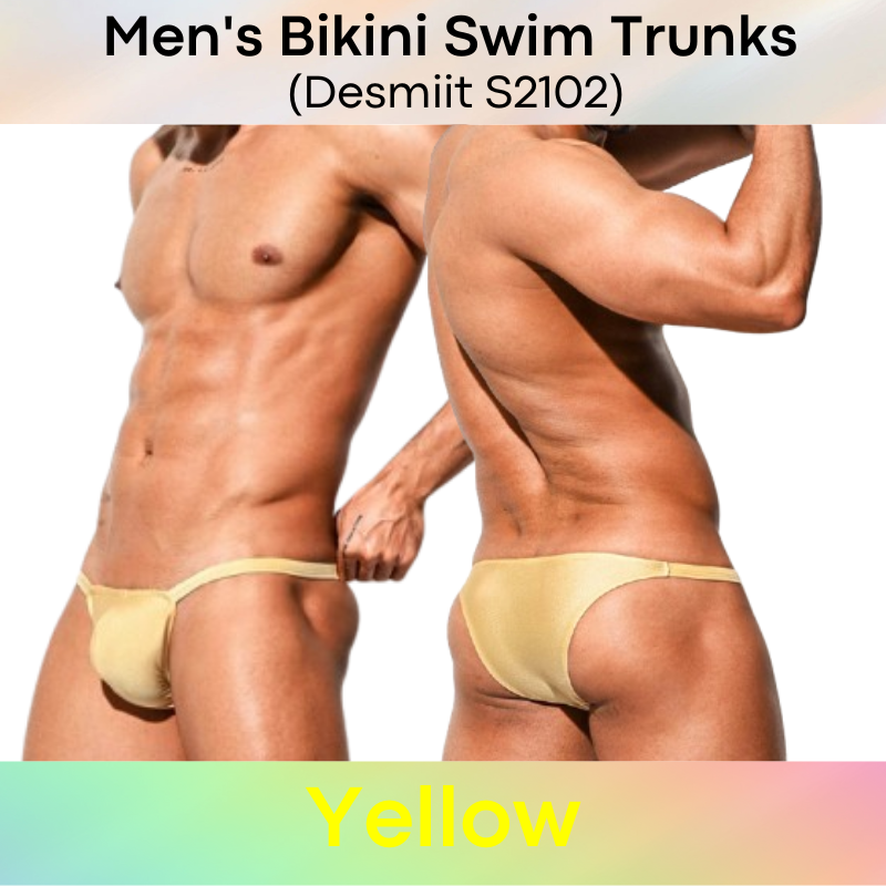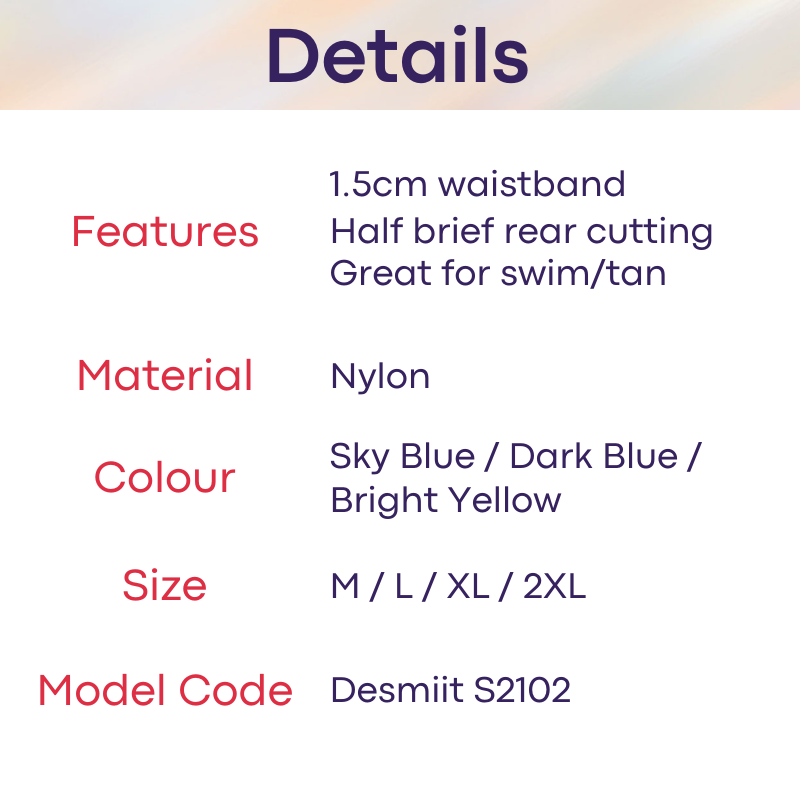 Made of nylon. Bikini swim trunks with mere 1.5cm waistband. Half rear design. Minimal cover yet sufficient for modesty. Great for swim or tan.