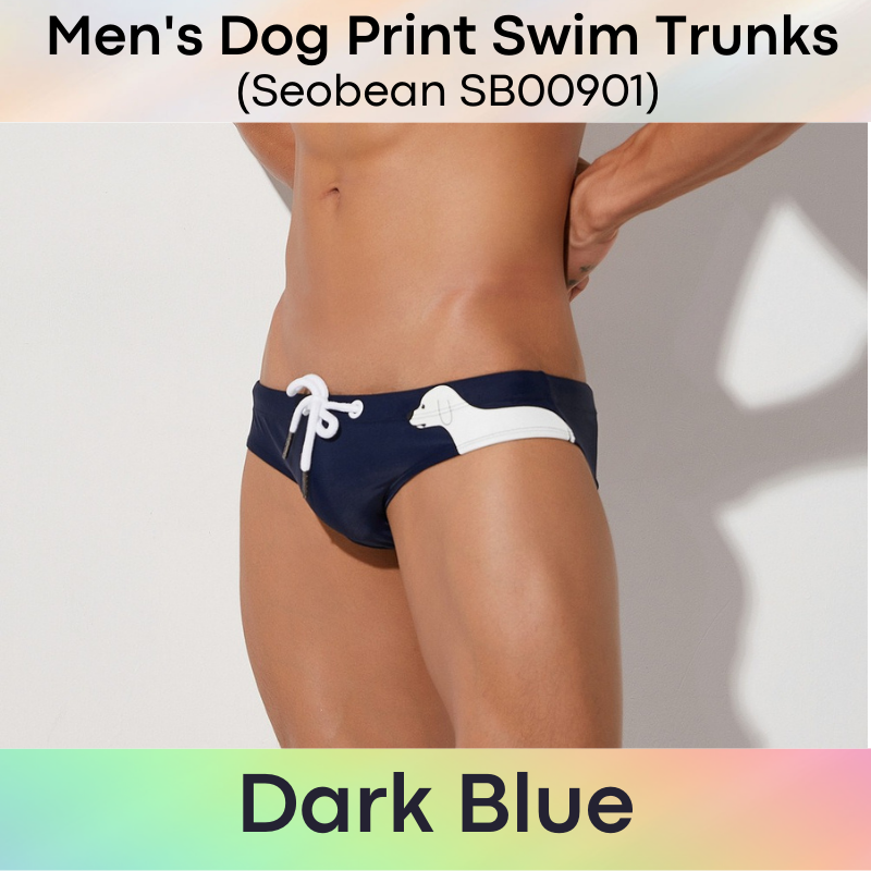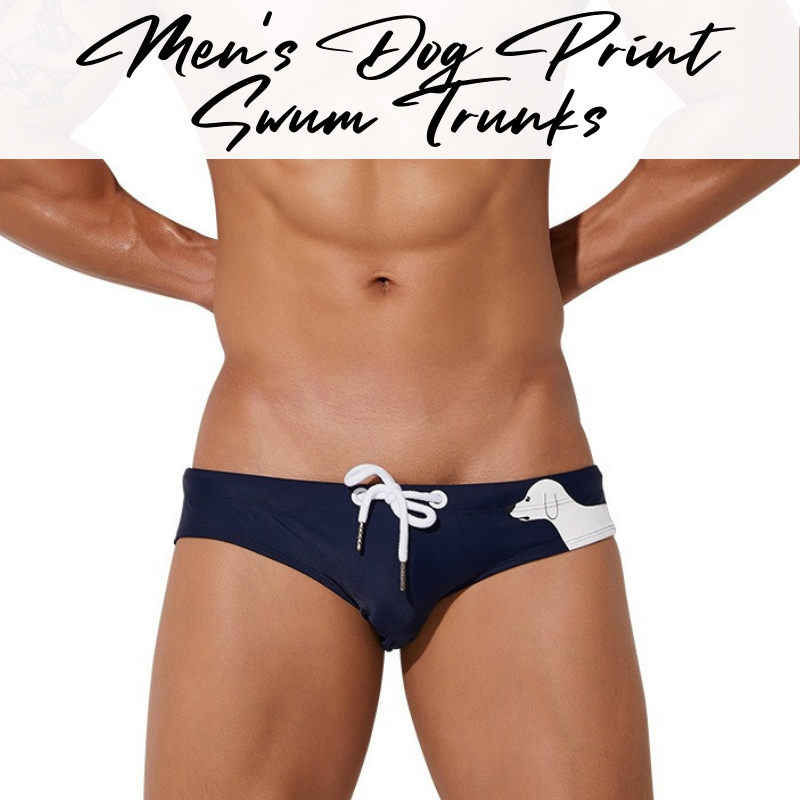 Made of nylon. Cute doggy print, on a classic swim trunks cutting.