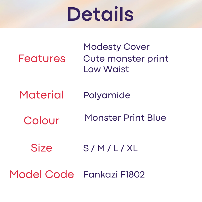 Made of polyamide. Cute monster print. Modesty padding helps teenagers whom are conscious of their body, or guys whom want to increase their self confidence.