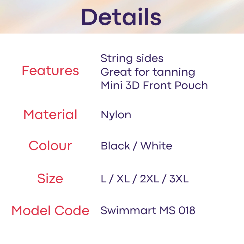 Made of nylon. Bikini string, minimalistic. Great for tanning. 3D mini front pouch.