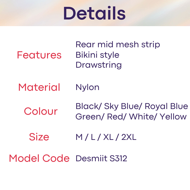 Made of nylon. Rear mid mesh strip for extra sexy appeal. Inner pouch lining to protect modesty. Drawstring for greater security. Bikini style brief cut, allows you to get the perfect tan line.