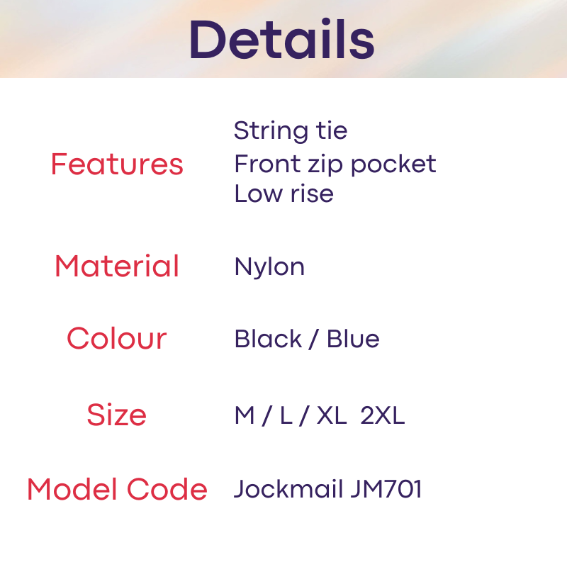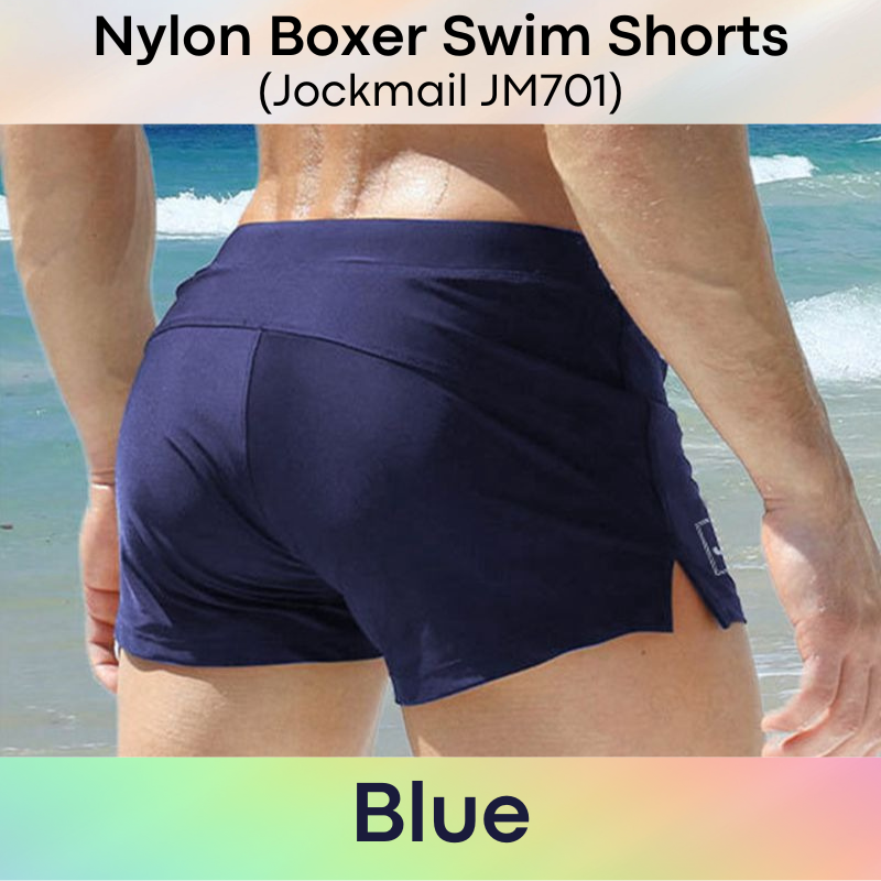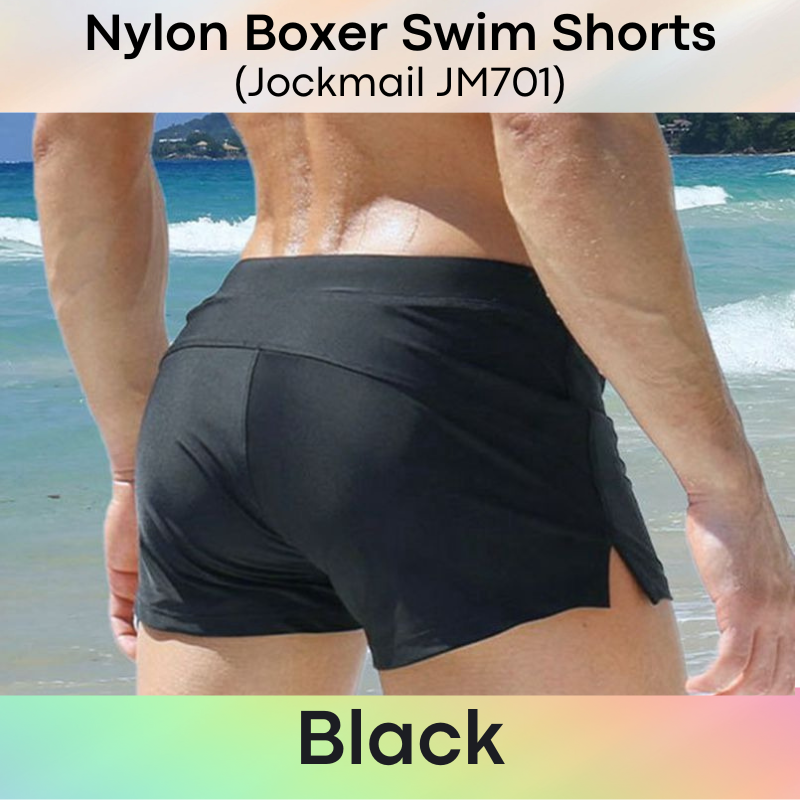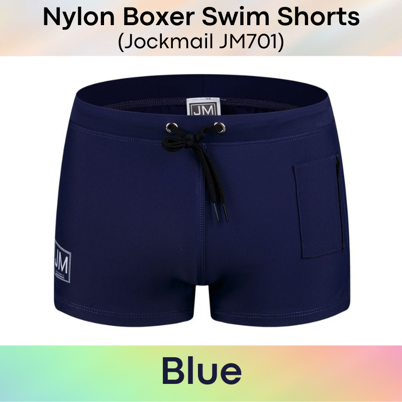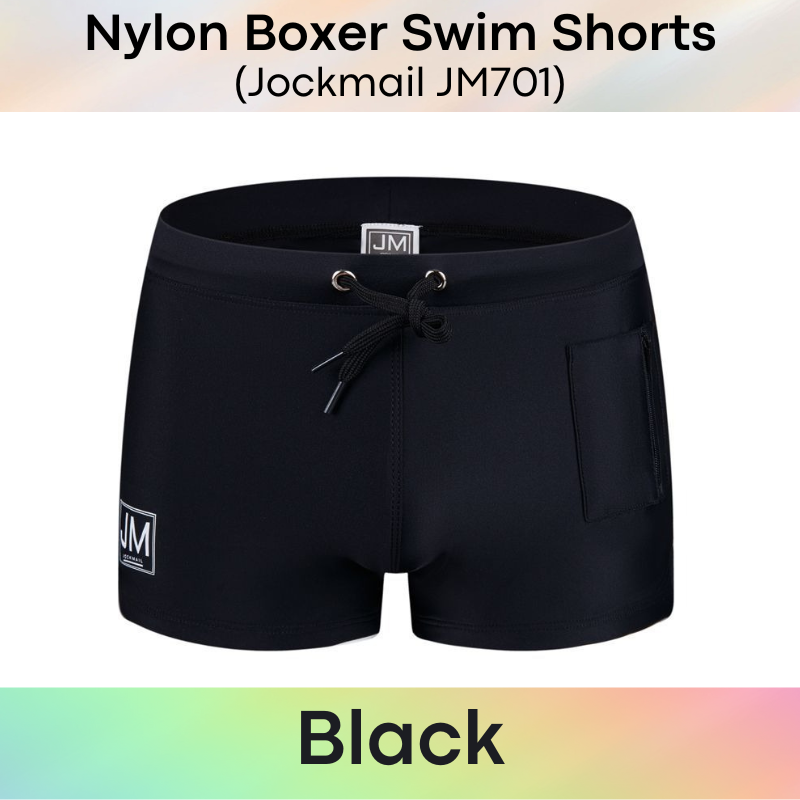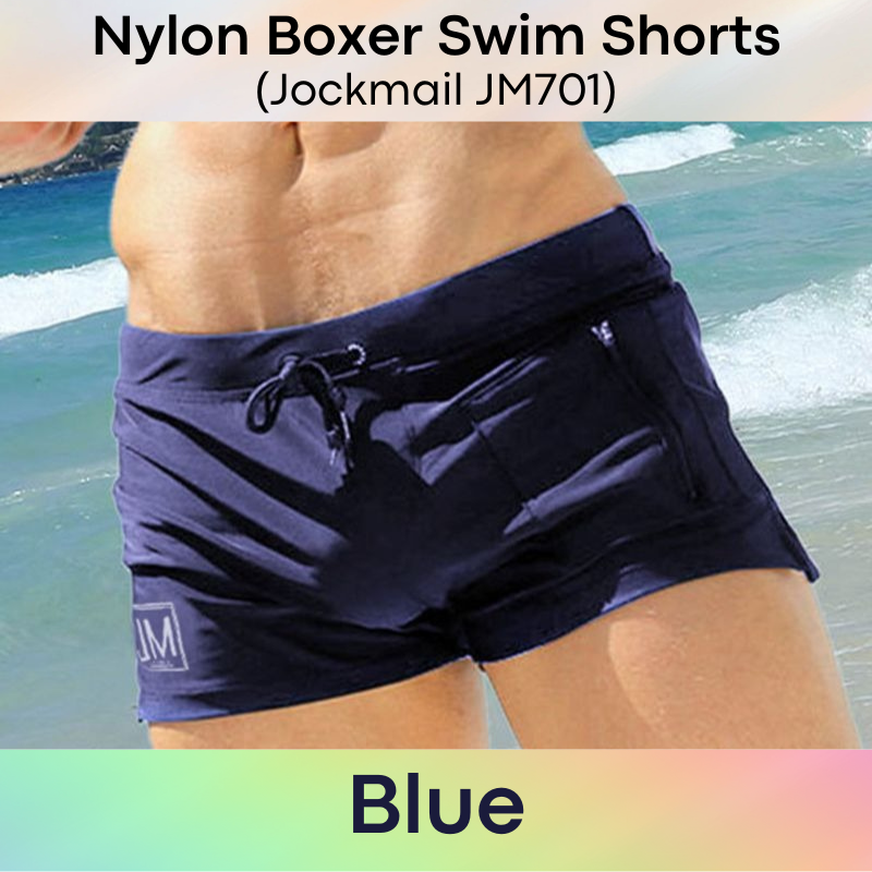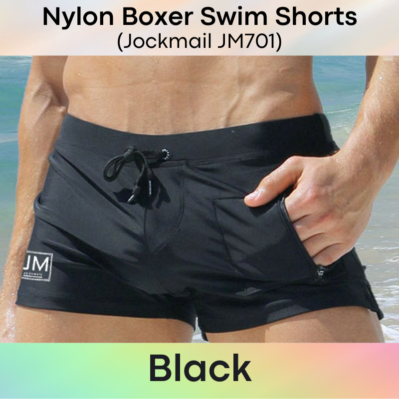 Made of nylon. Boxer shorts style swimwear. Drawstring waistband for greater security. Front side zip pocket to keep locker key etc.