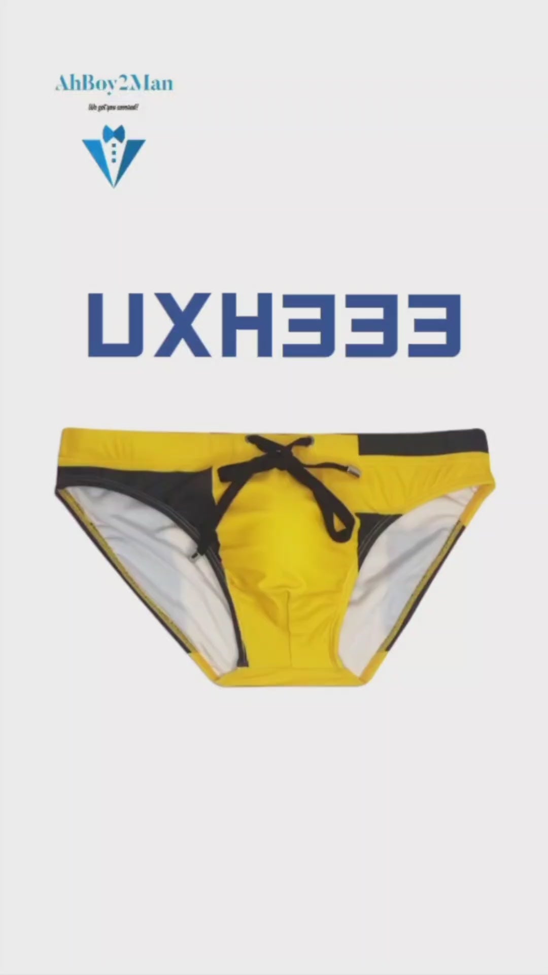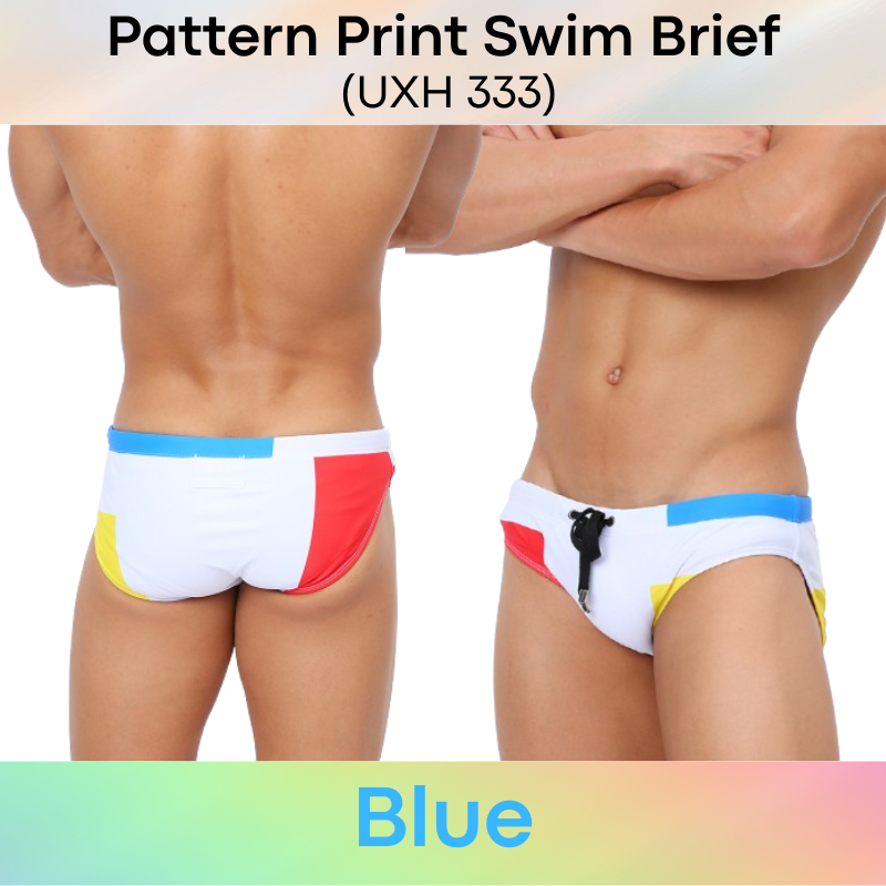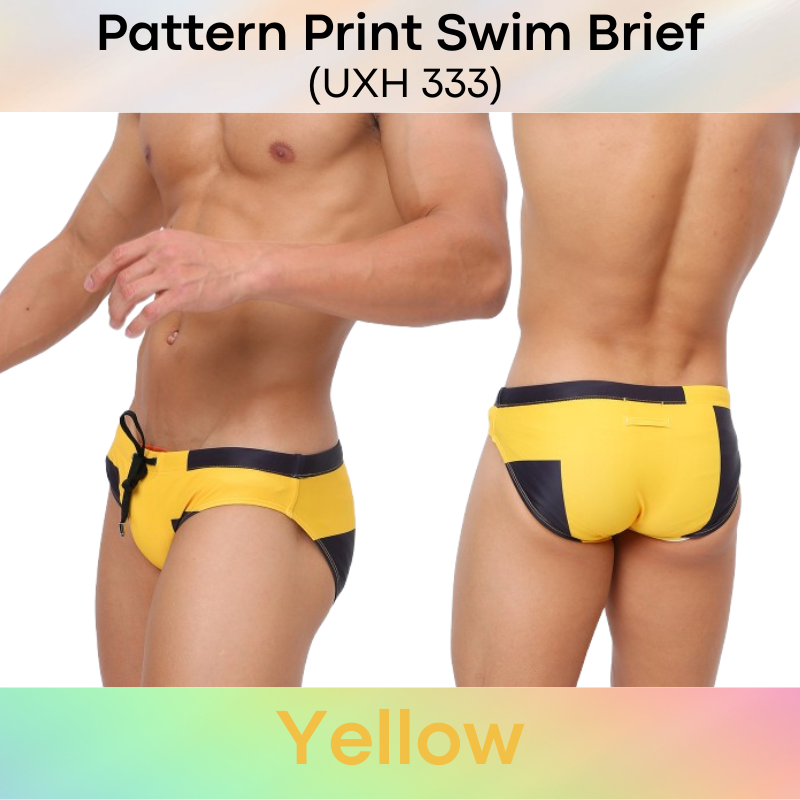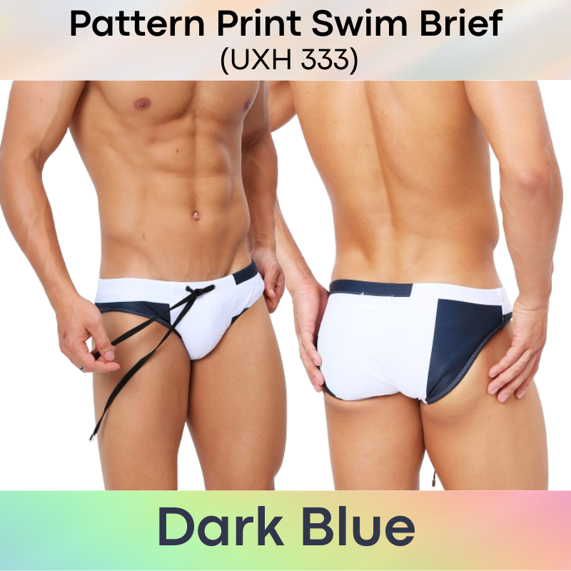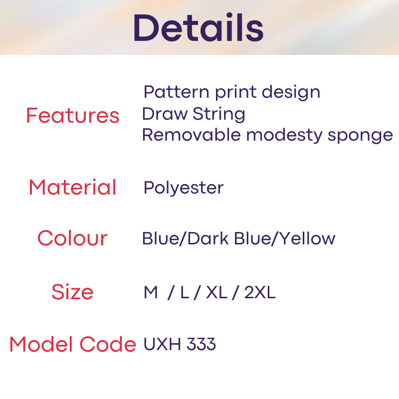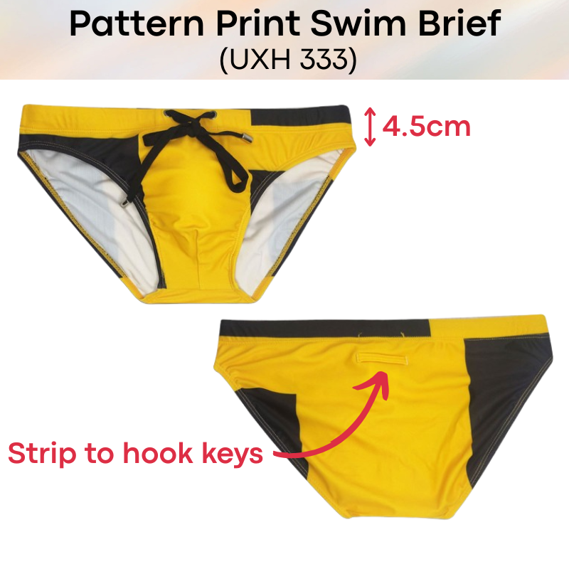 Made of polyester. Inner drawstring for greater security. Pattern print design. Rear print and sewn design brings out your posterior shape. 4.5cm wide side. Inner pouch with modesty sponge (removable). Pouch design is flat, for those whom prefer flat to 3D pouch design.