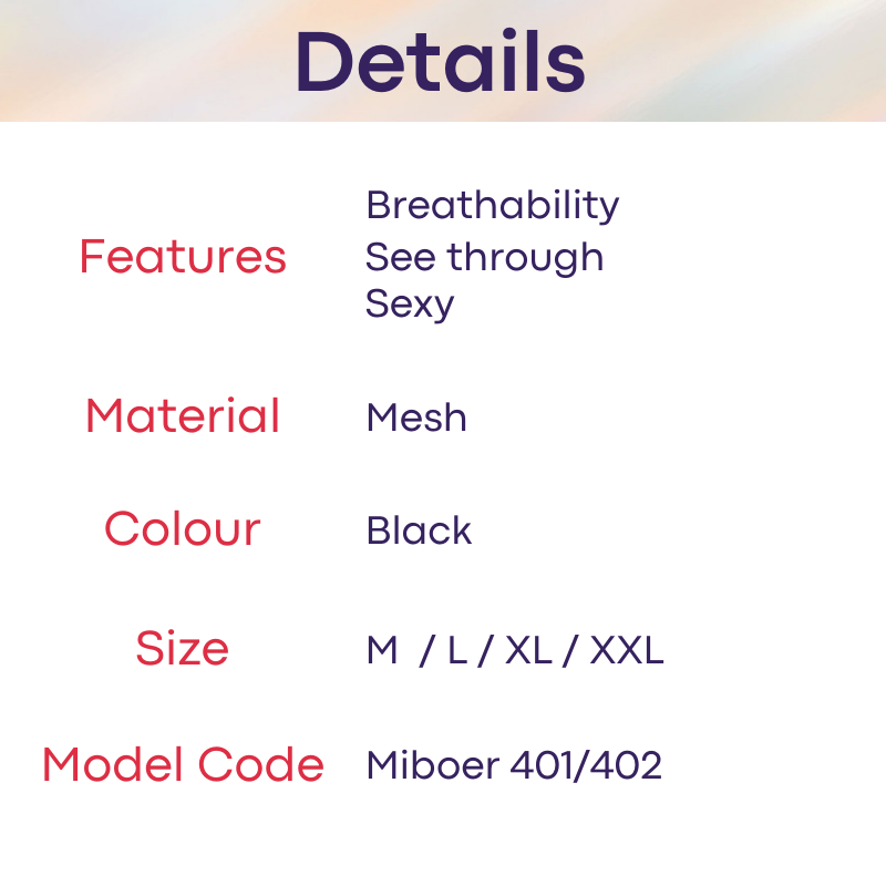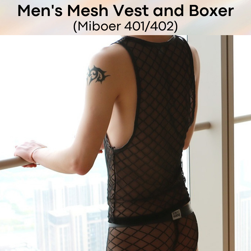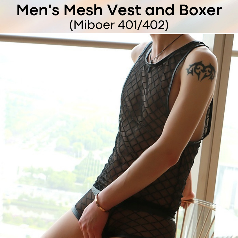 Made of mesh. Vest and boxer brief set, available in see through black mesh, adds mystery to your fun. Vest and Boxer Brief sizing comes in a set and is non inter-changeable for sizing.