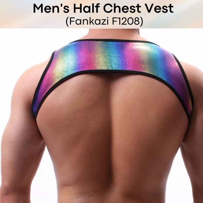 Made of polyesyer. Half chest vest, to show off your chest that you have been working so hard at the gym. Whether for performance, or for play, this sexy piece definitely make a statement! Get this together with Fankazi F1206 rainbow brief for the complete outfit.