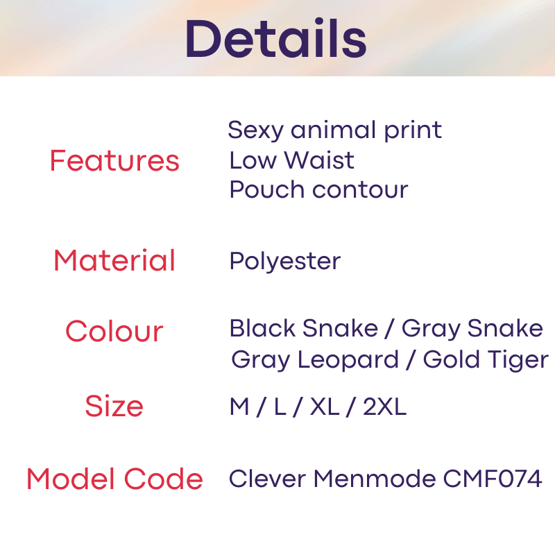 Made of polyester. Sexy animal prints to show your wild side. Low waist thong with ample pouch space.