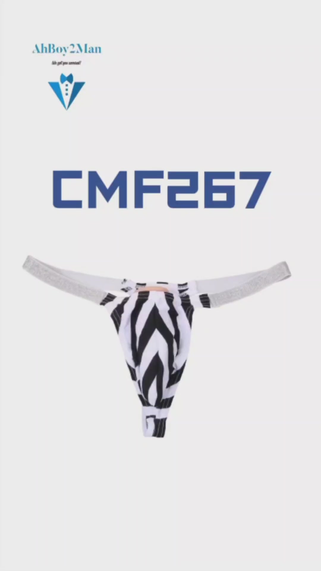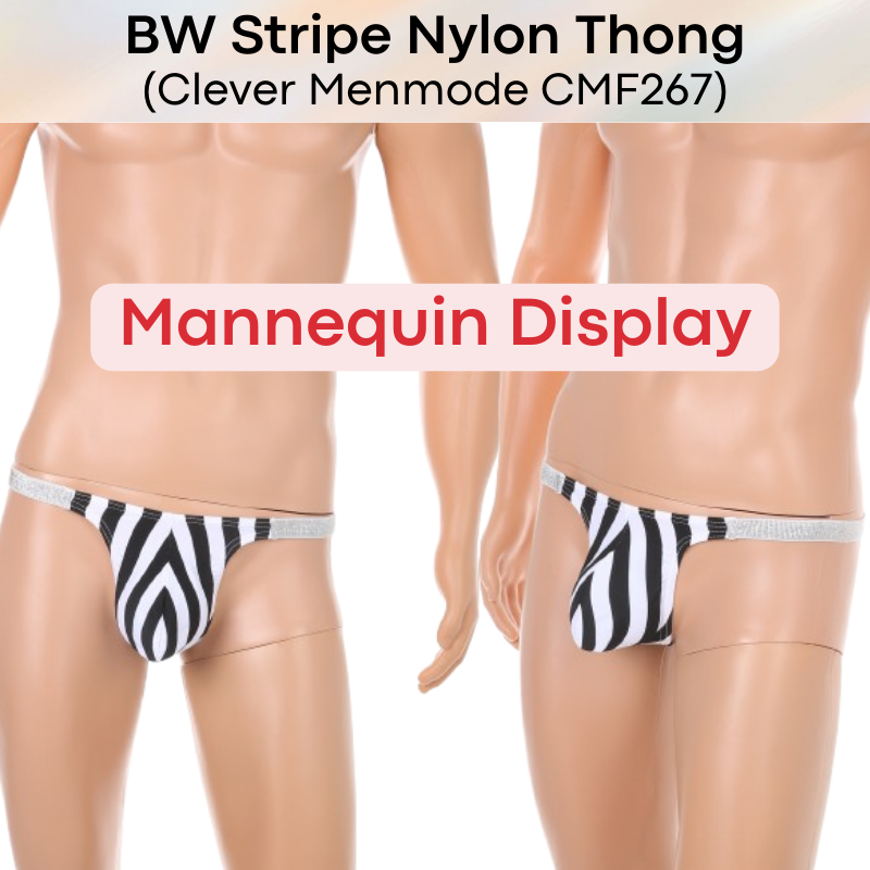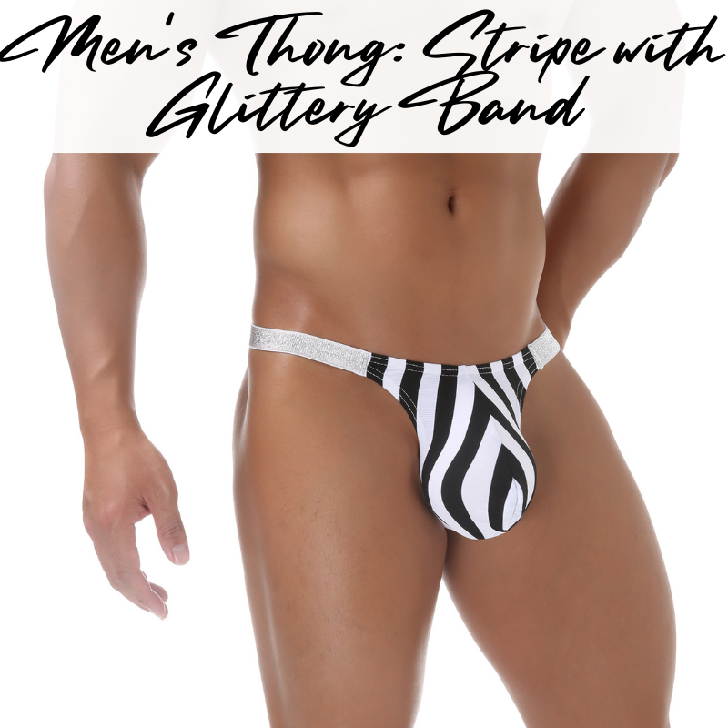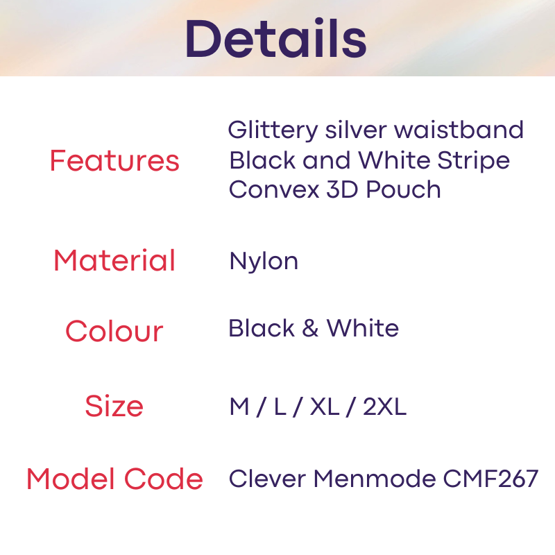 Made of nylon. Glittery silver waistband, 2.2cm width. Black and White Stripe print which accentuate your size. 3D convex pouch. Patterned material.