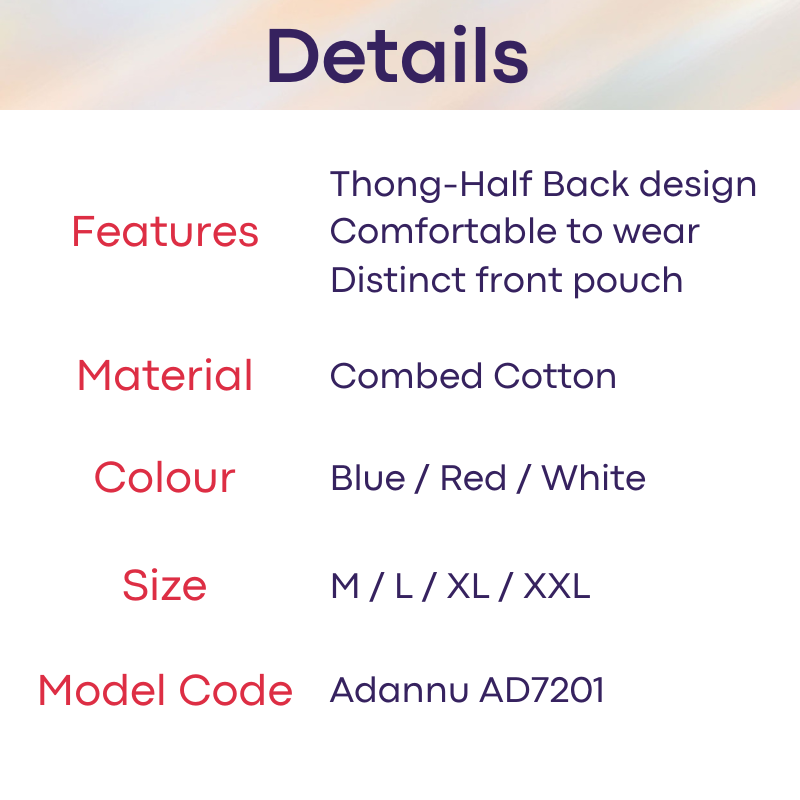 Made of combed cotton. Half back thong design. Comfortable to wear.