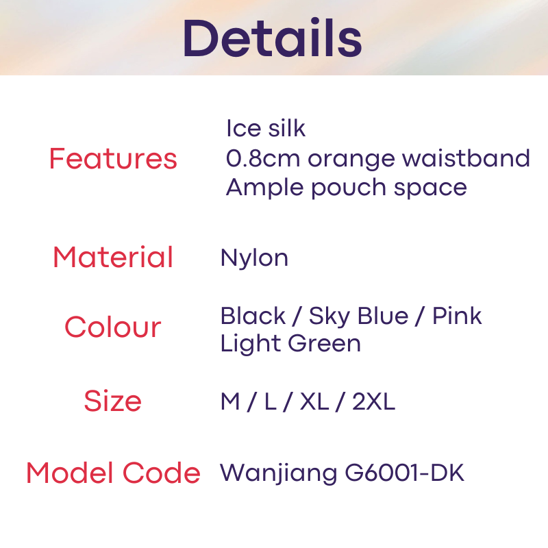 Made of nylon. Ice silk, smooth and thin feel. 0.8cm orange band. Ample pouch space.