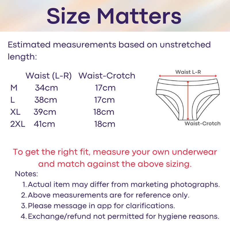 Please refer to seller' estimated measurements before placing order. There is no exchange/refund if sizing is wrong. To get the right measurement, measure with your underwear flat, from left to right of waistband. Thereafter, check against the size chart in this listing for the closer match. This is a general guideline, and does not factor in certain body shapes (thigh, bum etc) and elasticity of the waistband. Every brand/model varies in sizing measurements.