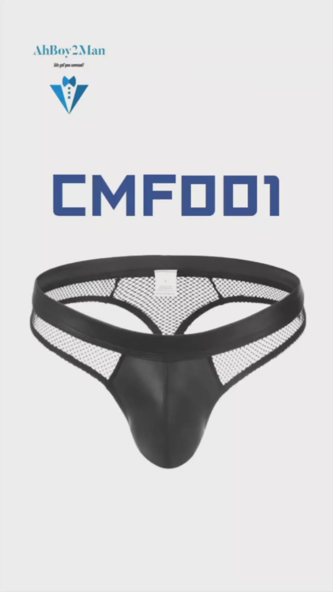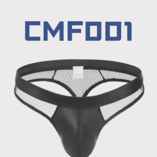 Made of nylon. Faux leather pouch and 3cm waistband. Net rear thong strip.