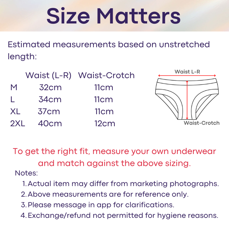 Please refer to seller' estimated measurements before placing order. There is no exchange/refund if sizing is wrong. To get the right measurement, measure with your underwear flat, from left to right of waistband. Thereafter, check against the size chart in this listing for the closer match. This is a general guideline, and does not factor in certain body shapes (thigh, bum etc) and elasticity of the waistband. Every brand/model varies in sizing measurements.