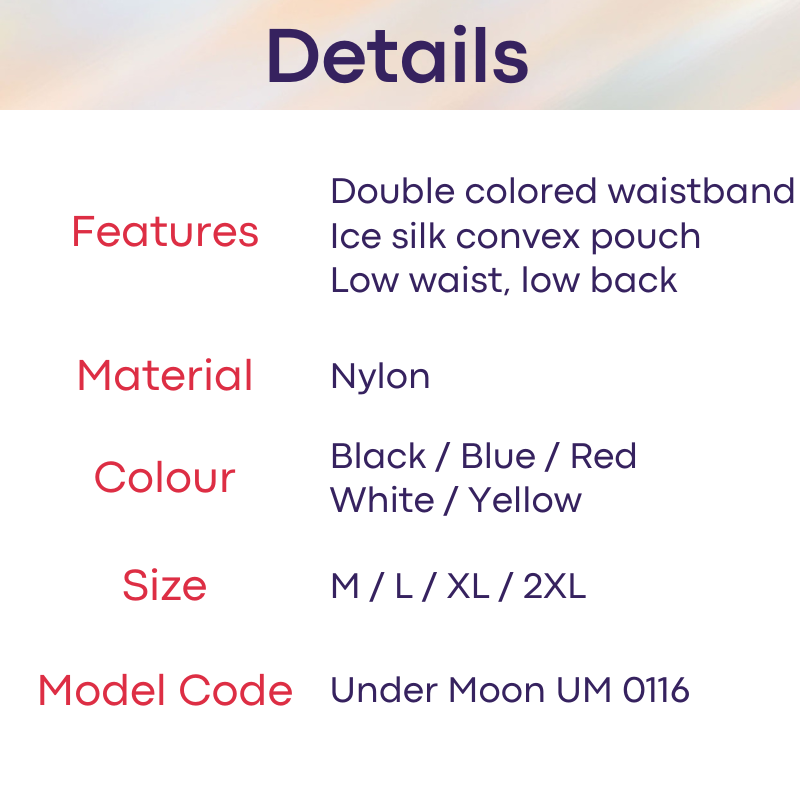 Made of nylon. Ice silk semi 3D convex pouch. Double colored waistband.