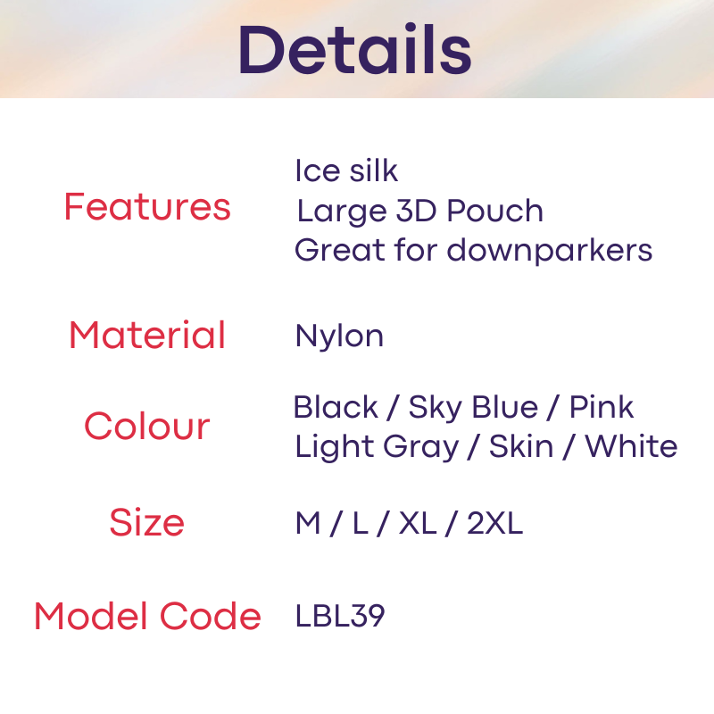 Made of nylon. Large 3D pouch, great for those with ample assets and downparkers. Ice silk smooth.