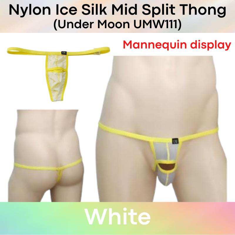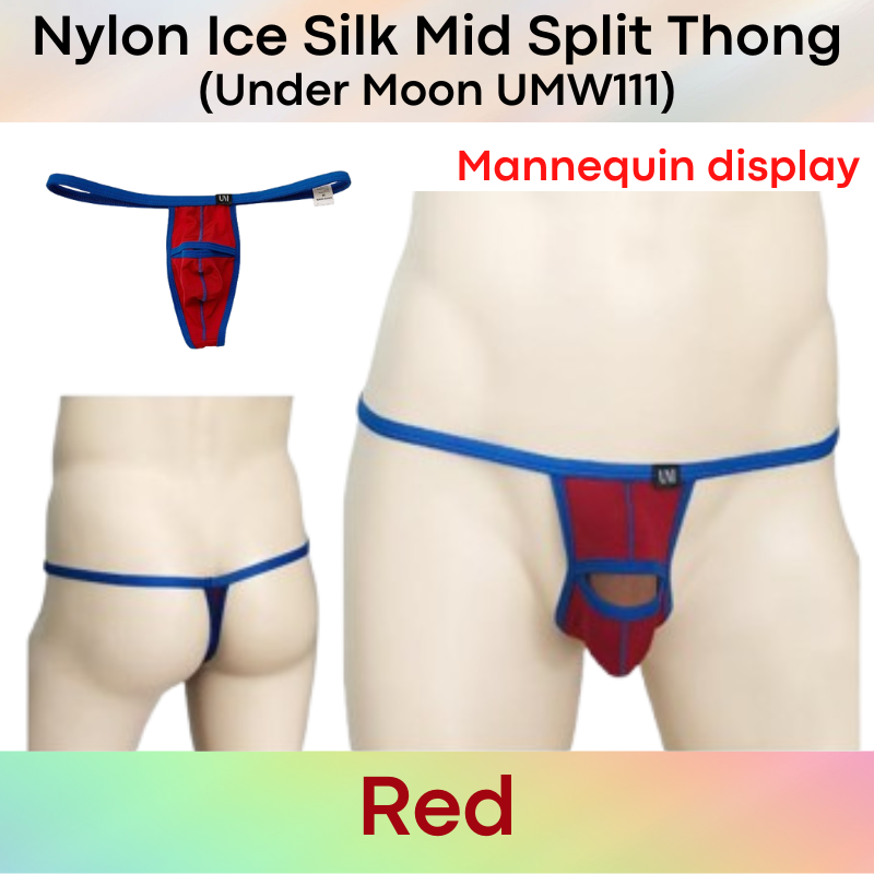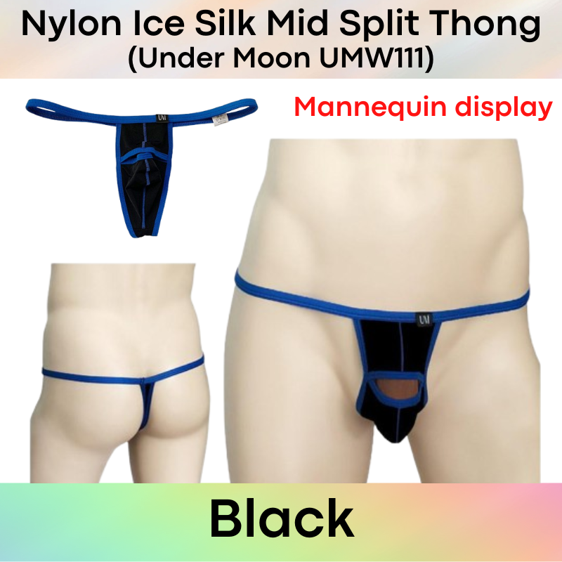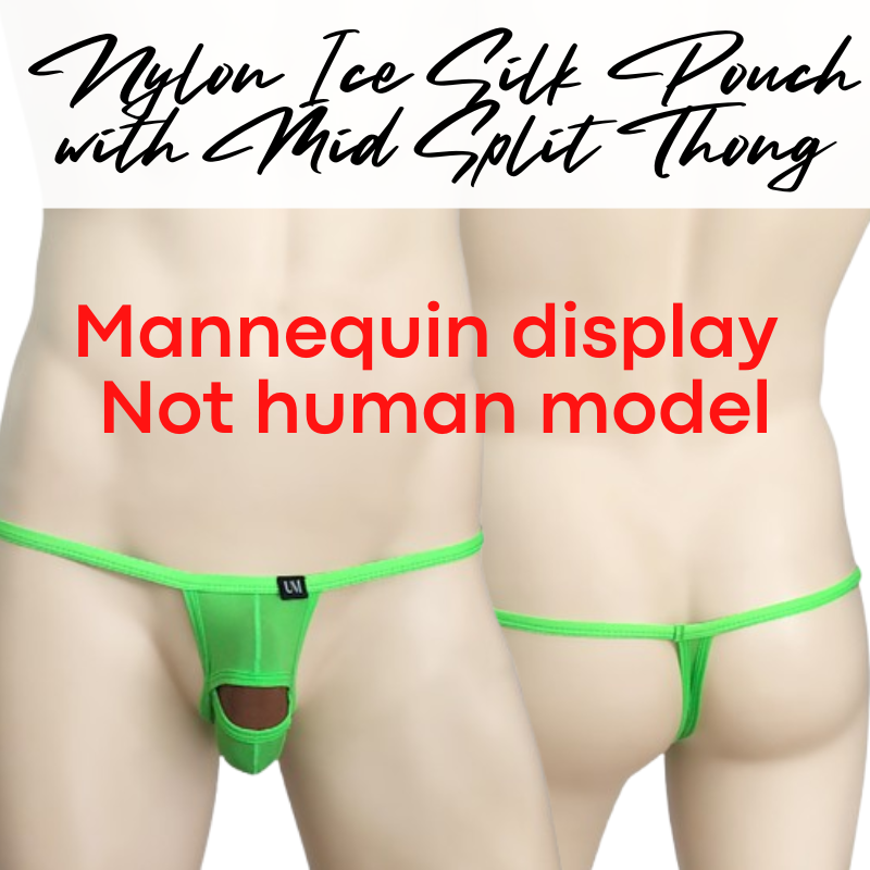 Made of nylon. Ice silk pouch with mid split. Low waist, low back for discreet wear. 1.3cm waistband.
