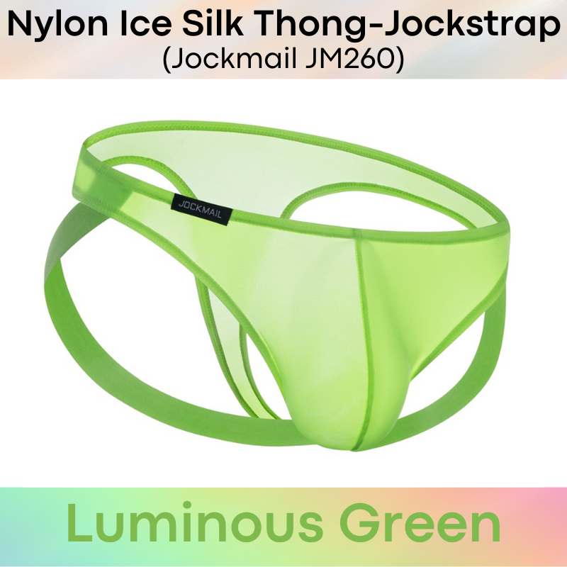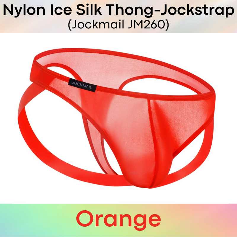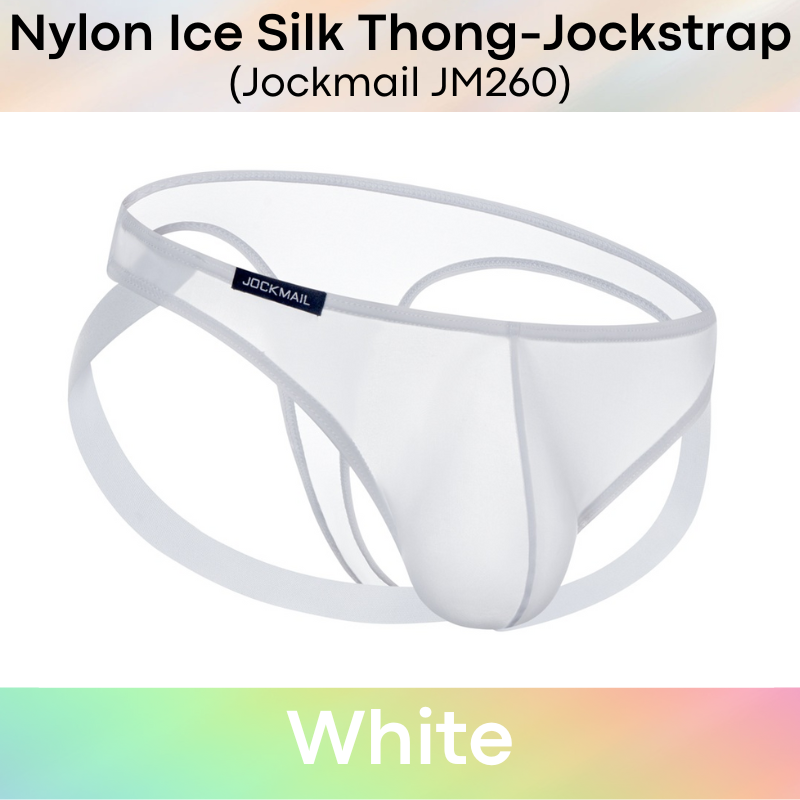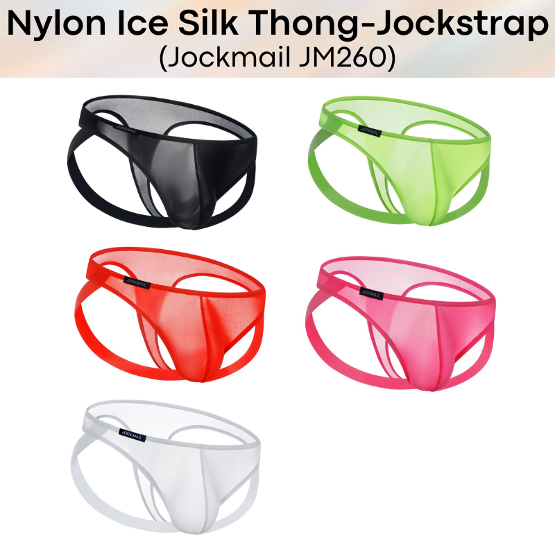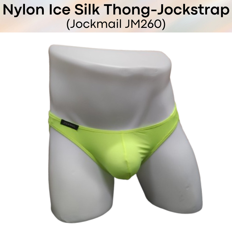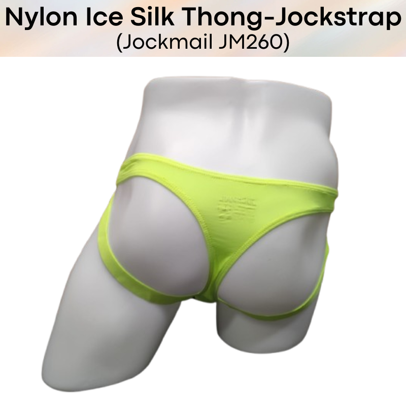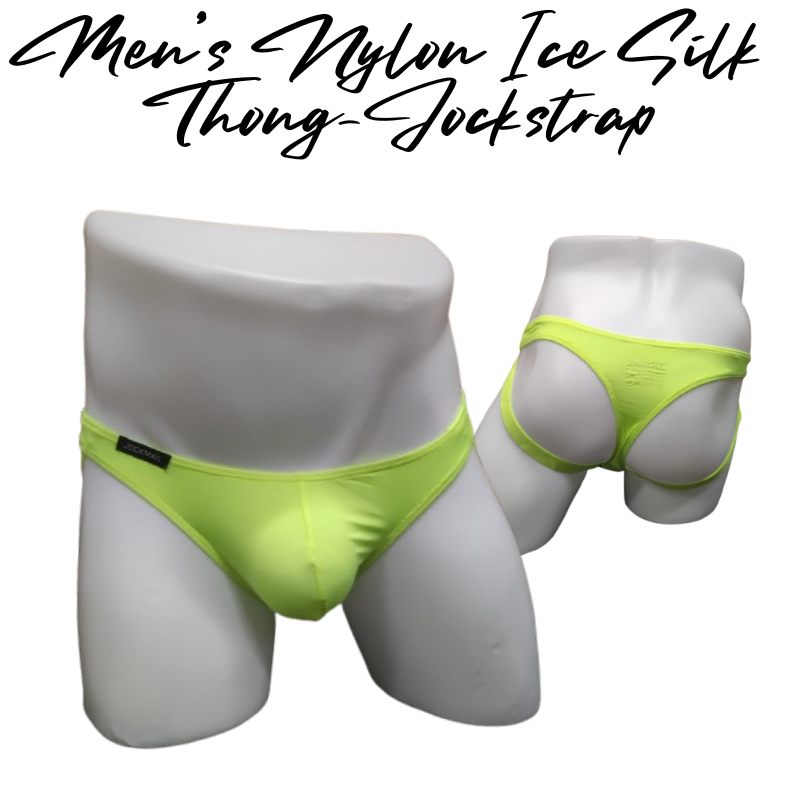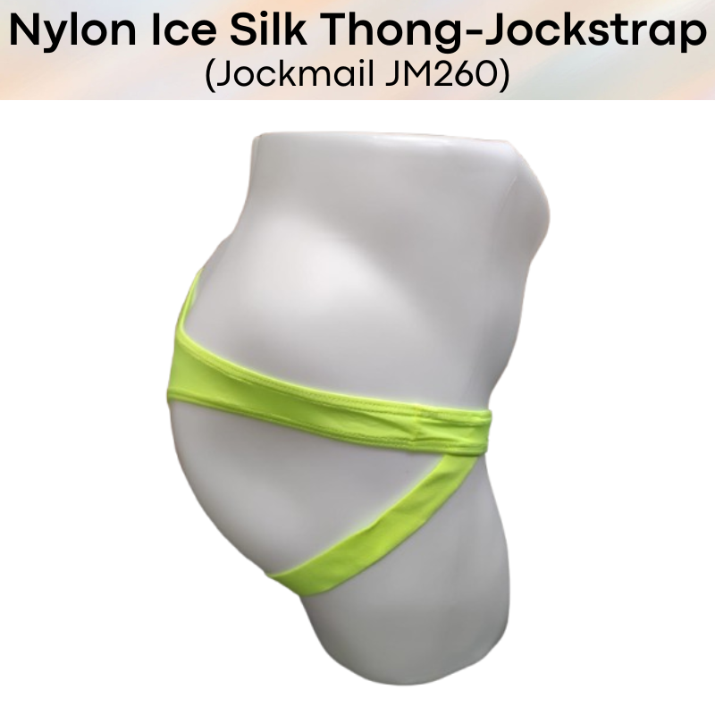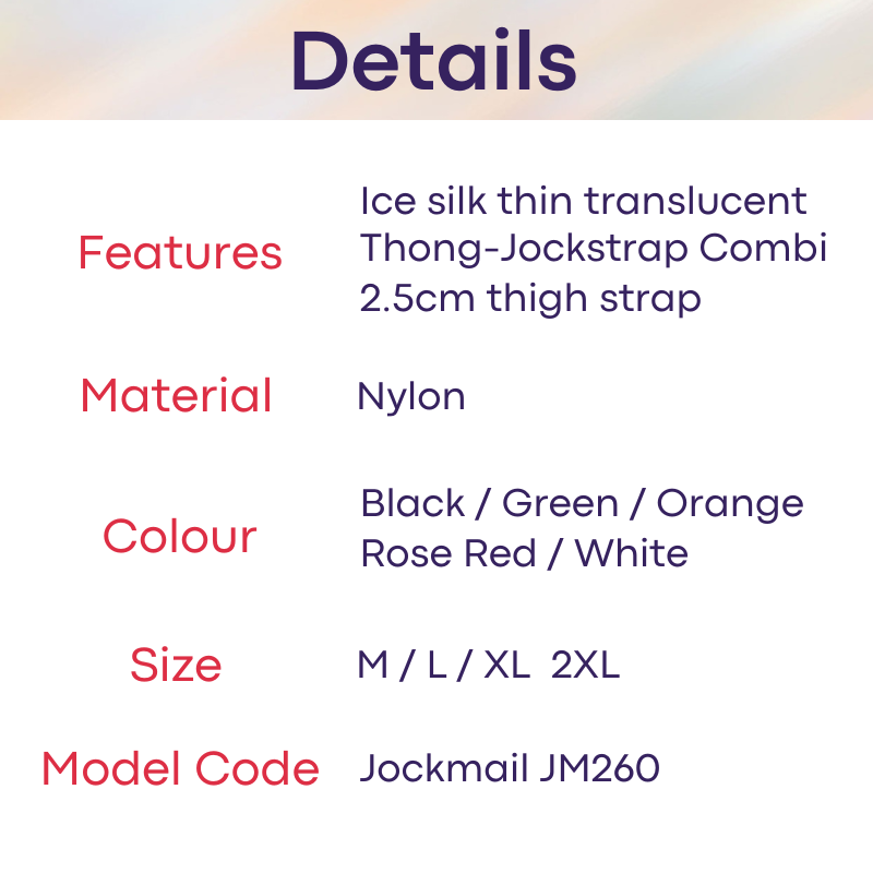 Made of nylon. Ice silk smooth , thin and translucent. Combination of T-back and jockstrap. Thigh strap measures 2.5cm.