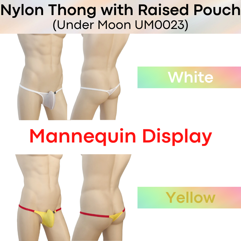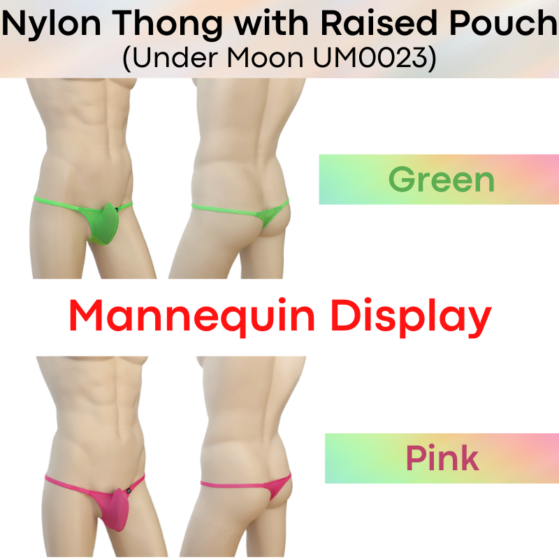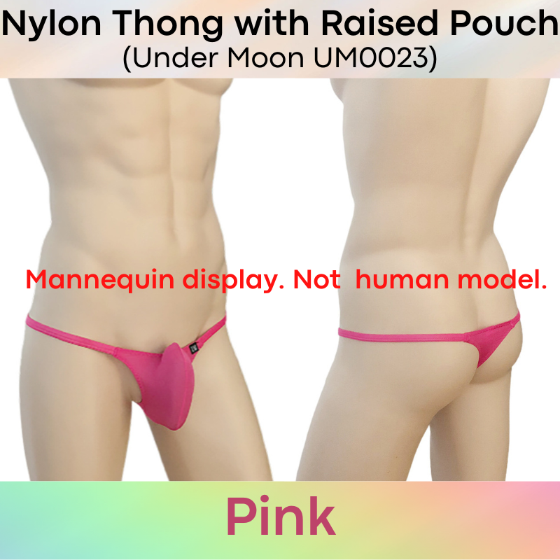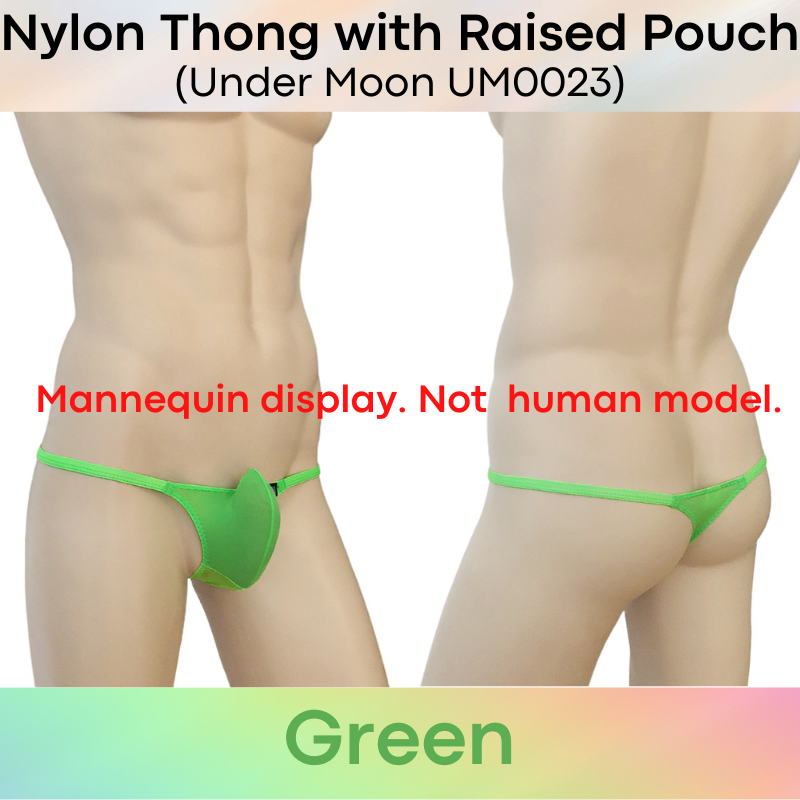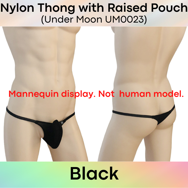 Made of nylon. Comes with 5cm strip mesh at base for breathability. 1cm string band. Raised front pouch, 3D pouch to show off your assets.