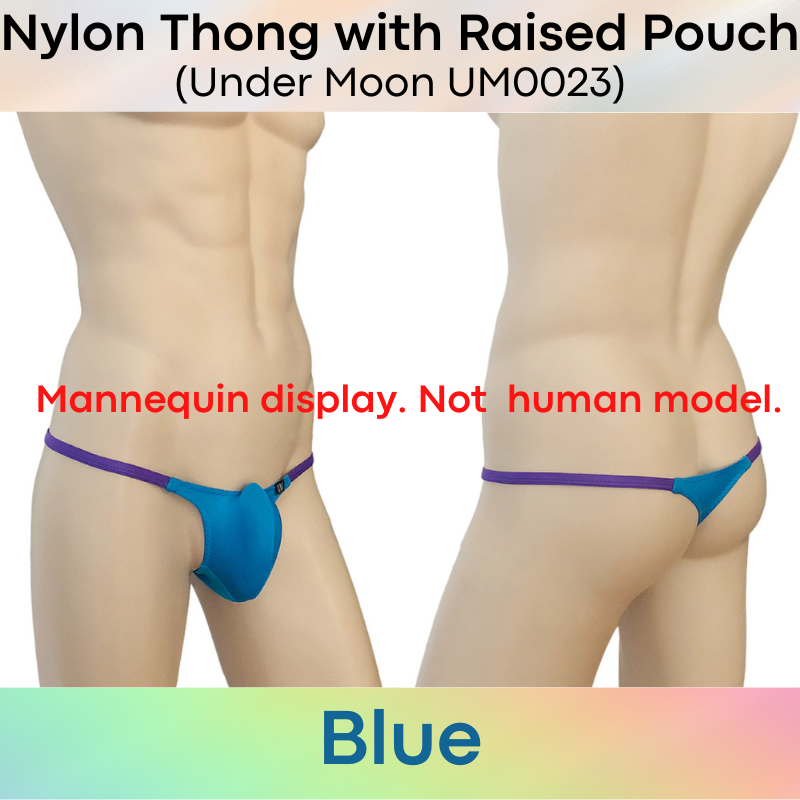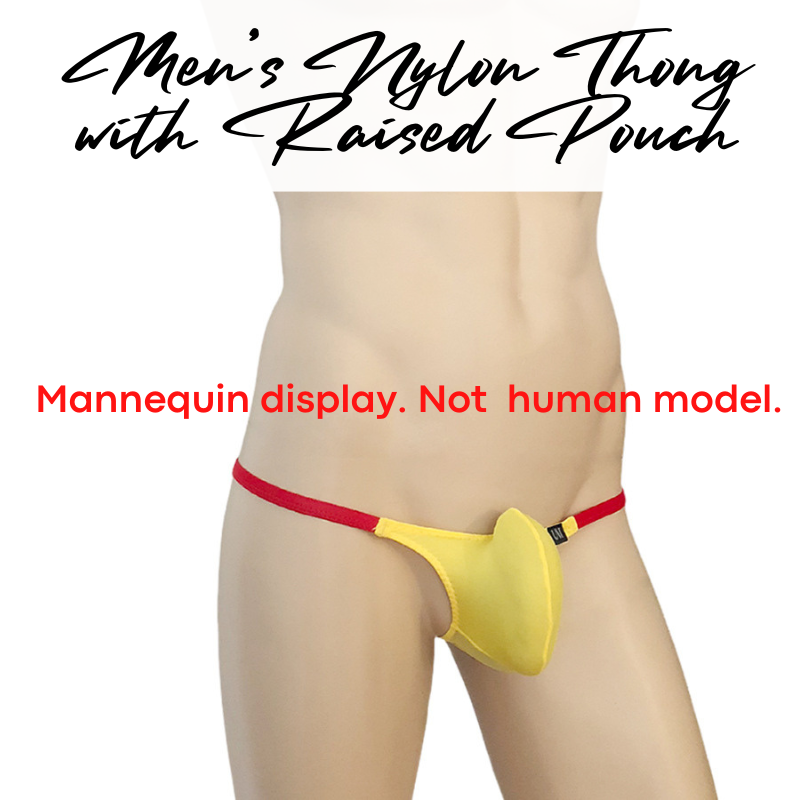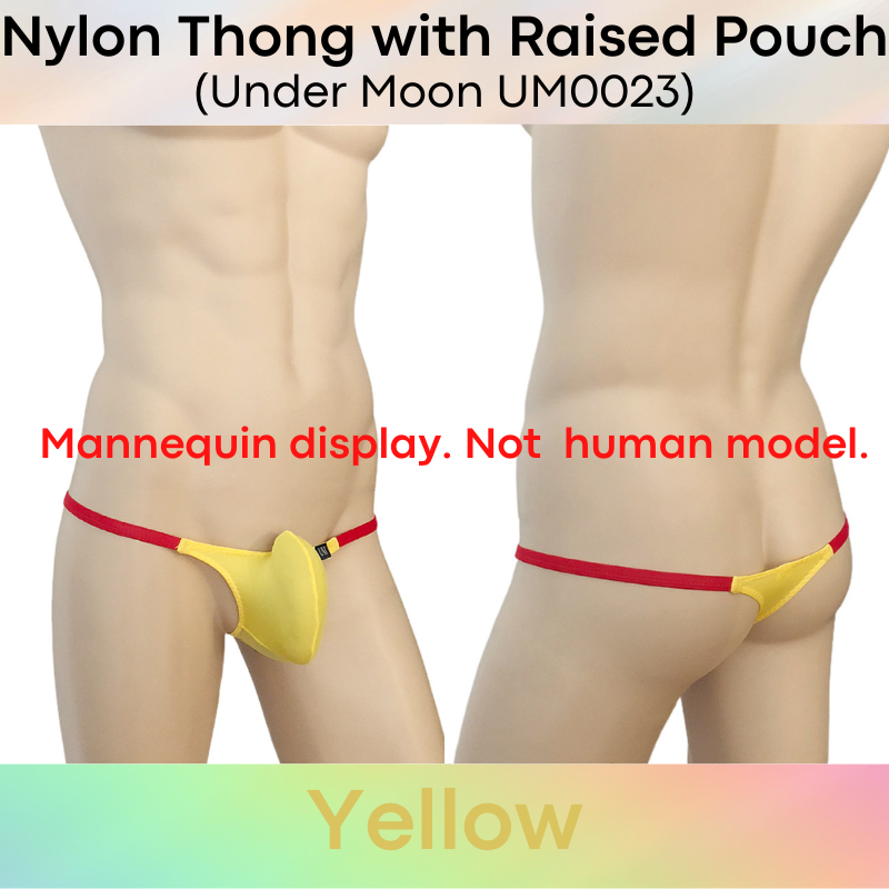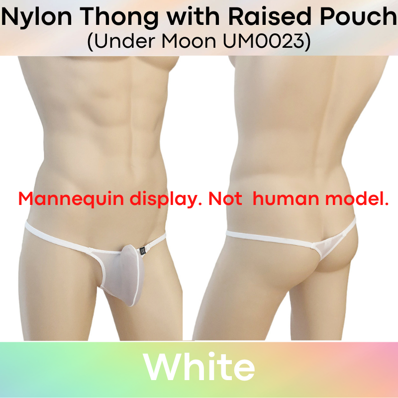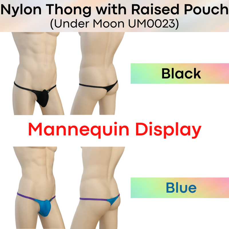 Made of nylon. Comes with 5cm strip mesh at base for breathability. 1cm string band. Raised front pouch, 3D pouch to show off your assets.