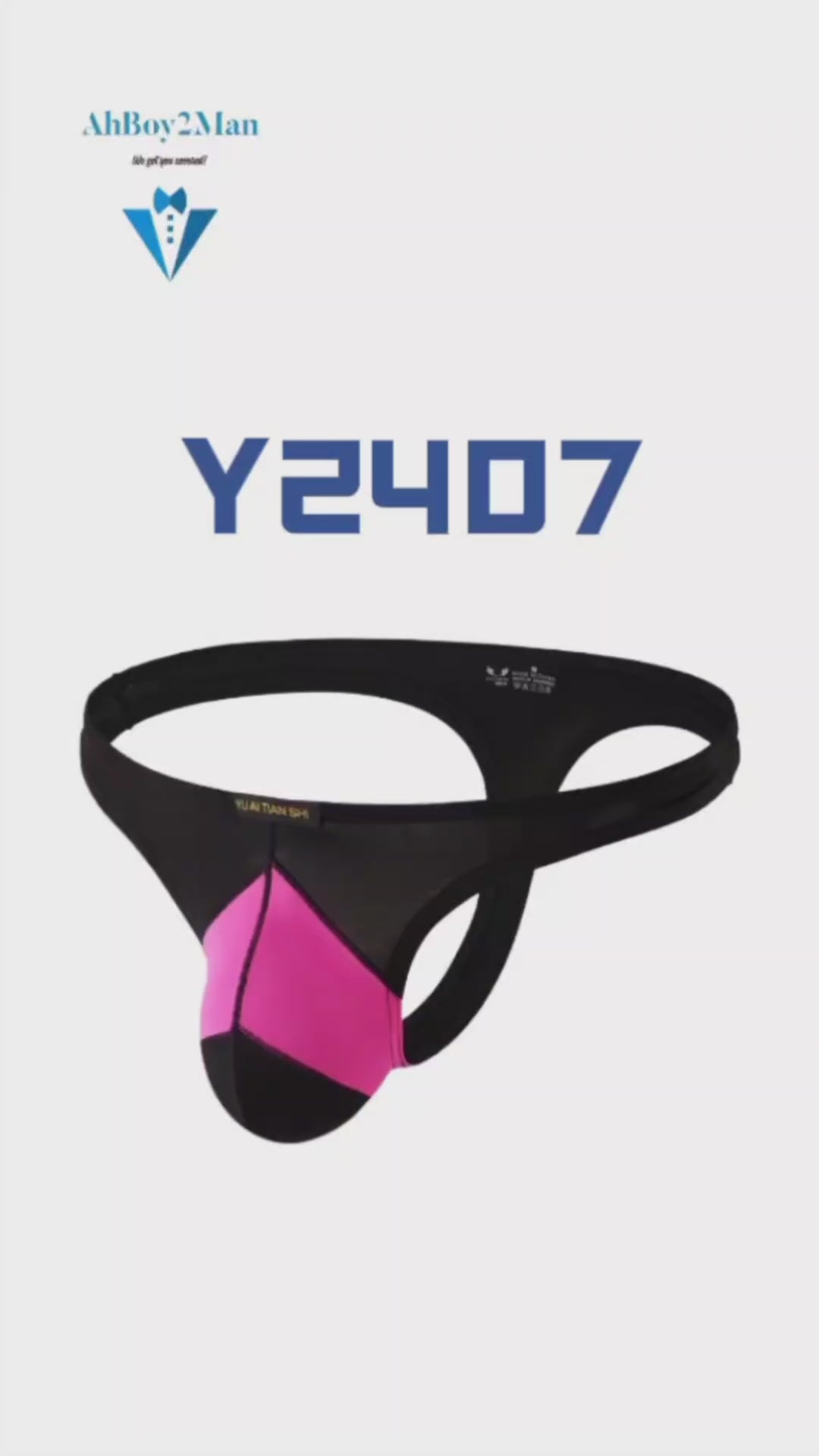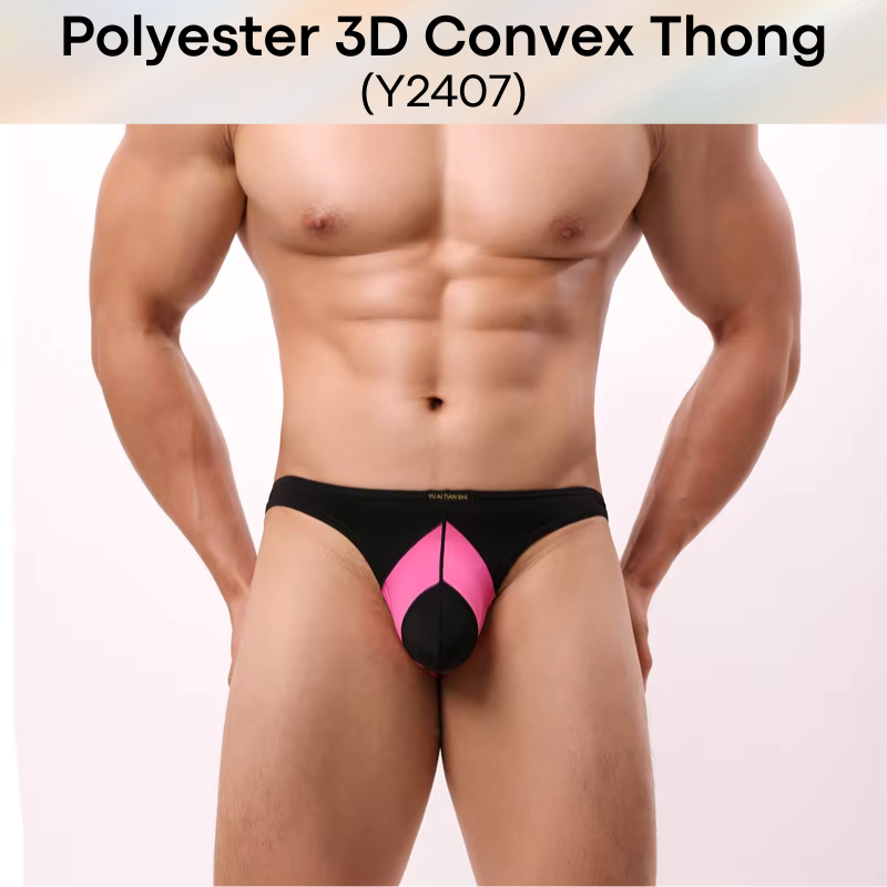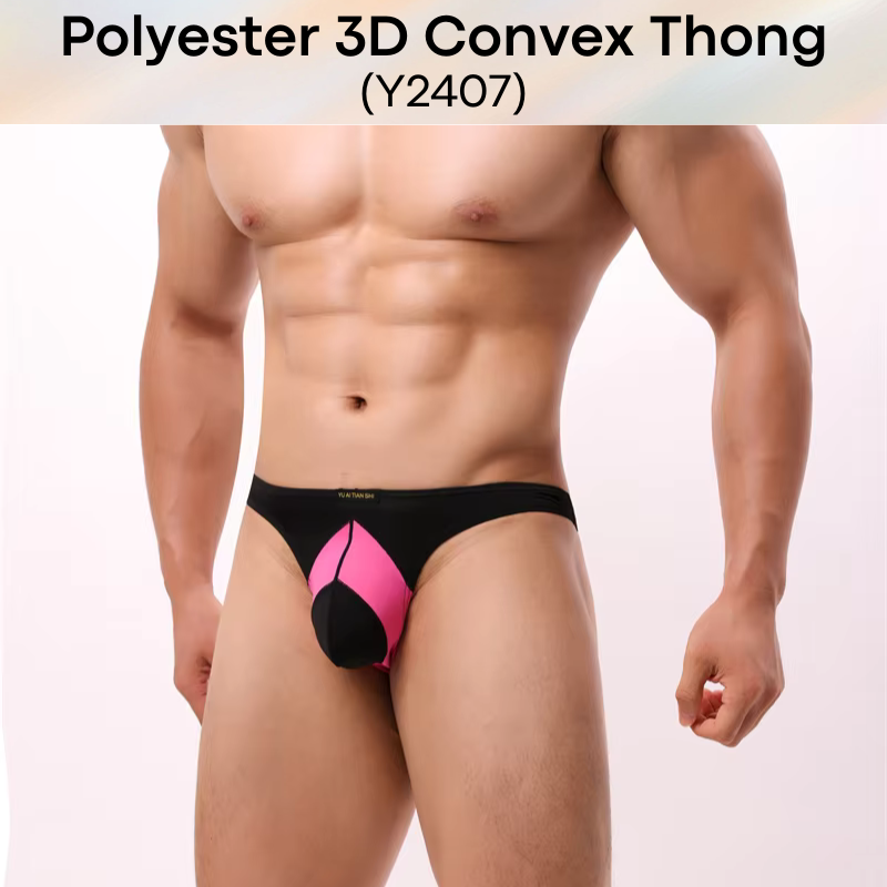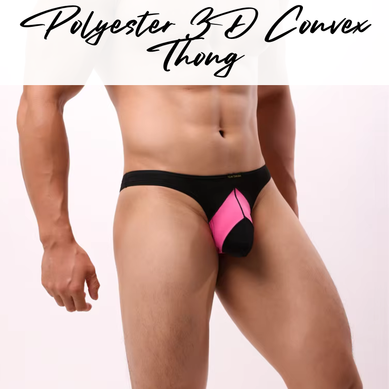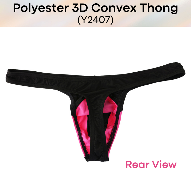 Made of polyester. Low rise dual color tone thong. 3D convex pouch to enhance and emphasise your assets. Semi transluscent.