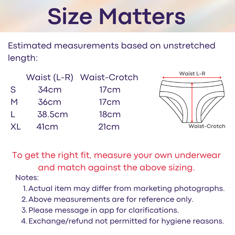 Please refer to seller' estimated measurements before placing order. There is no exchange/refund if sizing is wrong. To get the right measurement, measure with your underwear flat, from left to right of waistband. Thereafter, check against the size chart in this listing for the closer match. This is a general guideline, and does not factor in certain body shapes (thigh, bum etc) and elasticity of the waistband. Every brand/model varies in sizing measurements.
