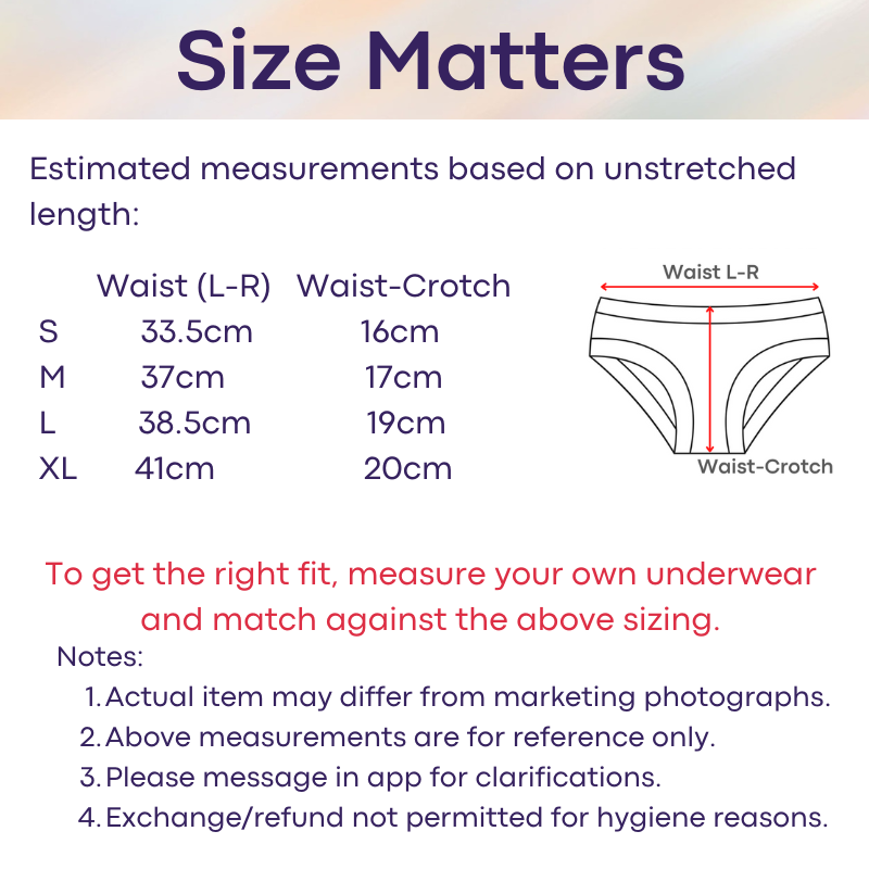 Please refer to seller' estimated measurements before placing order. There is no exchange/refund if sizing is wrong. To get the right measurement, measure with your underwear flat, from left to right of waistband. Thereafter, check against the size chart in this listing for the closer match. This is a general guideline, and does not factor in certain body shapes (thigh, bum etc) and elasticity of the waistband. Every brand/model varies in sizing measurements.