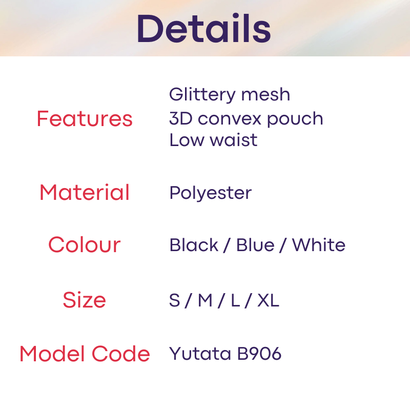 Made of polyester. Mesh see through with glitter to enhance your style. Ample pouch space with convex shape.