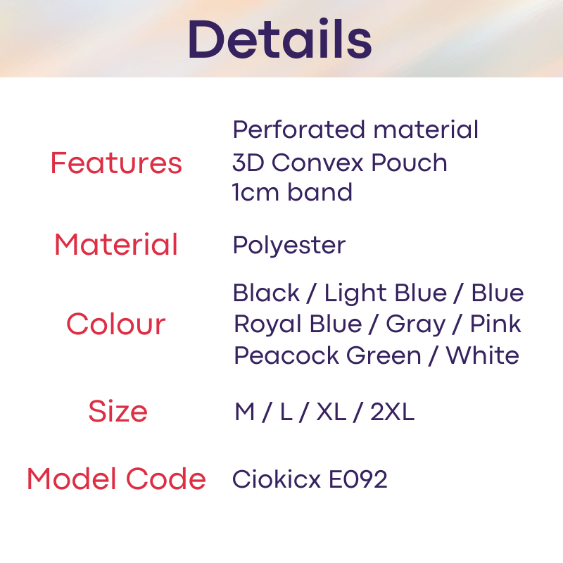 Made of polyester. Air holes for breathalibility. 3D convex pouch to enhance your assets. 8 colors to match your style.
