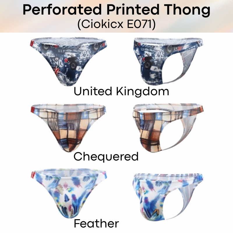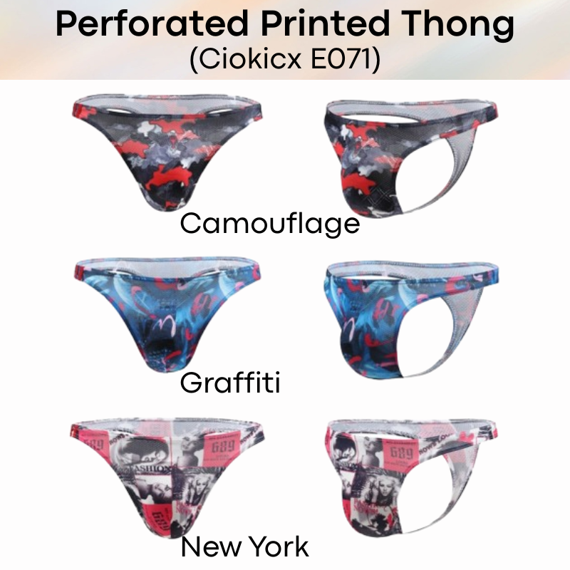 Made of polyester. Air holes for breathalibility. 3D convex pouch to enhance your assets. 8 different print designs to suit your style.