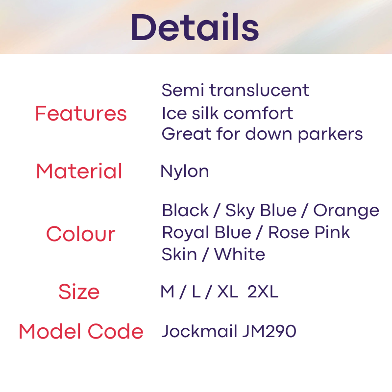 Made of polyester. Semi translucent. Gret for down parkers, close to skin. Ice silk comfort.