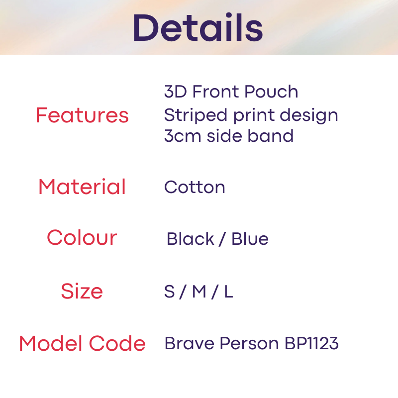 Made of cotton. Strip print design, with a 3D front pouch. Low waist with 3cm side band.