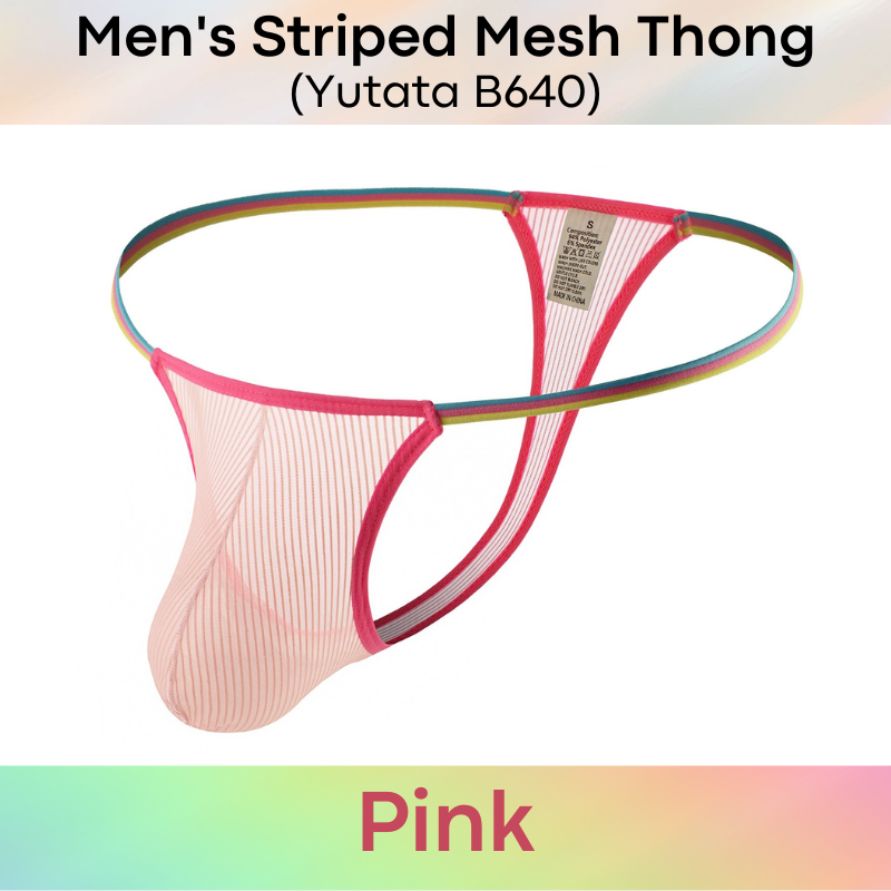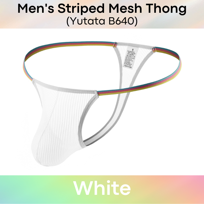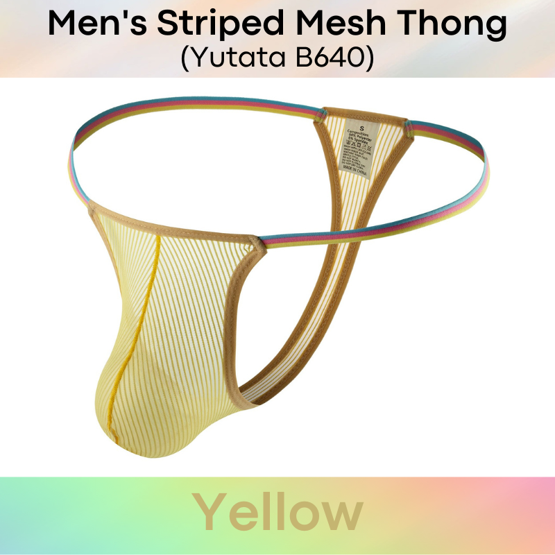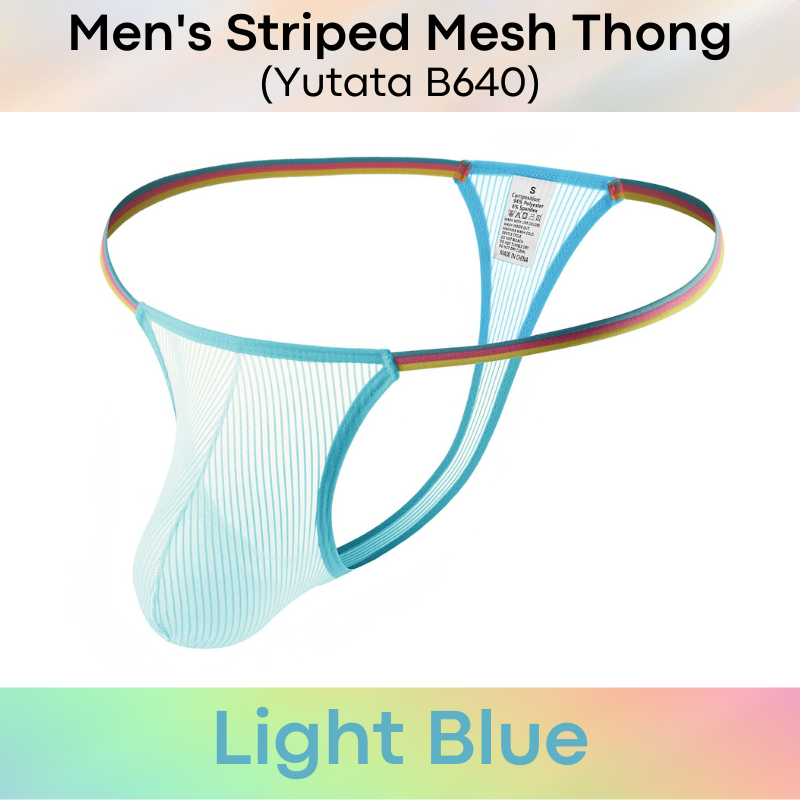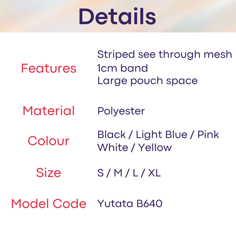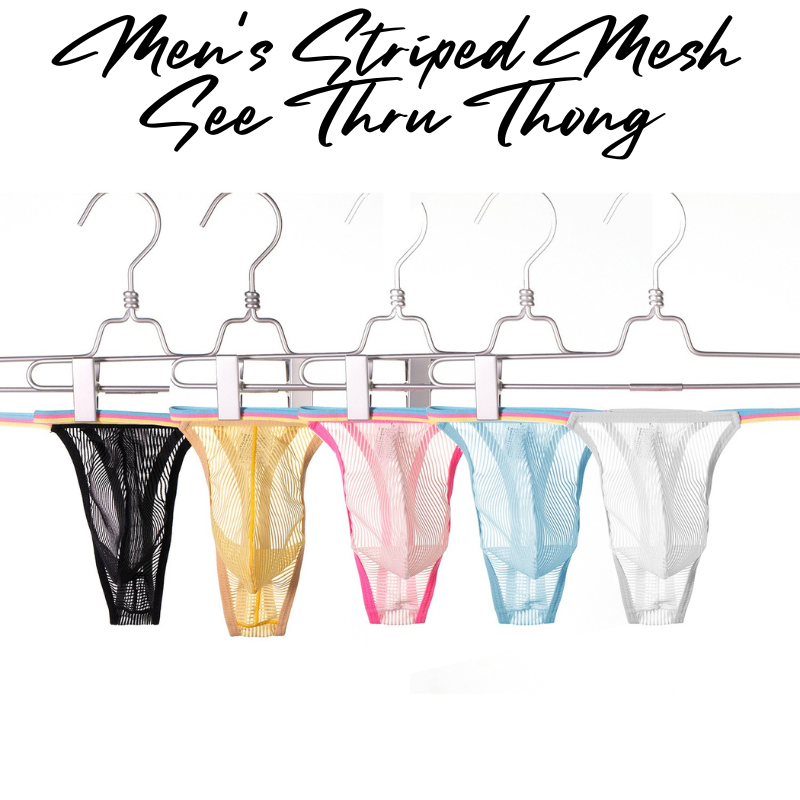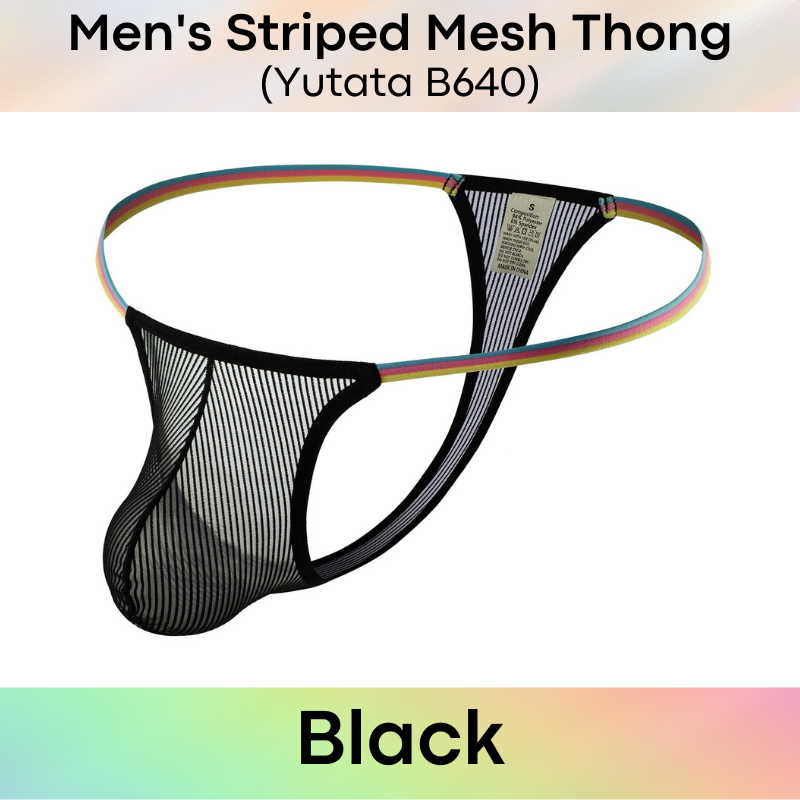 Made of polyester. Striped mesh see through. Large pouch space for those well-endowed or like space for play. 1cm thin rainbow waistband.