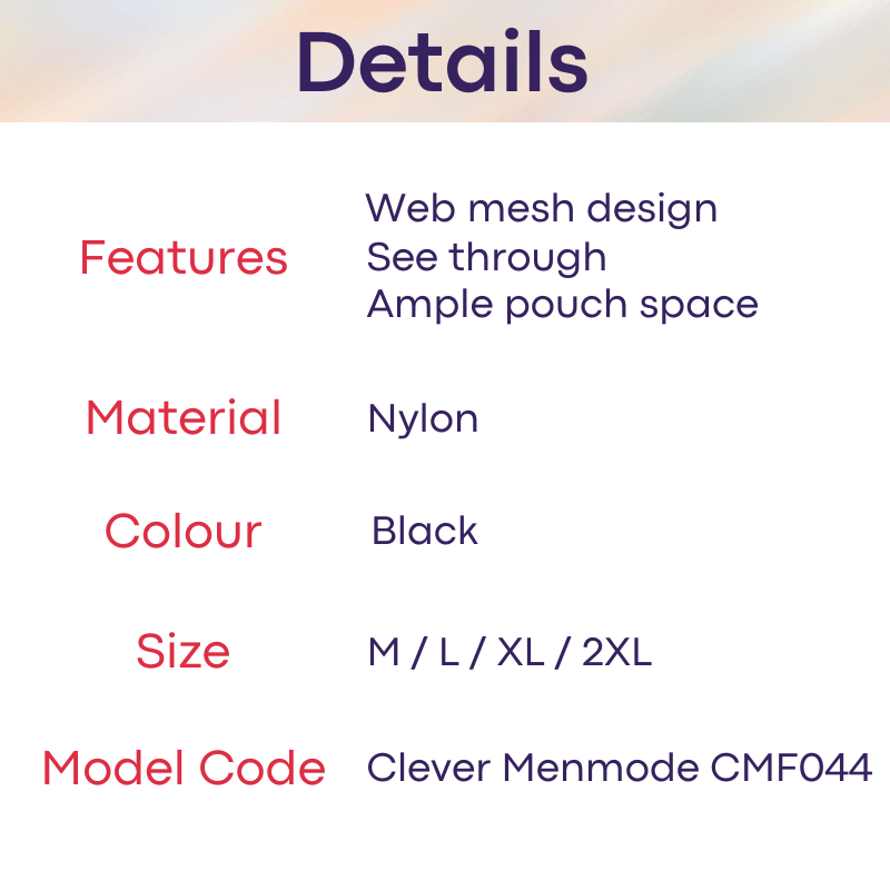 Made of nylon. Web mesh design. Versatile wear, whether you park up or down. Recommended to park down to bring out the web design. See through.