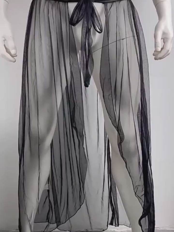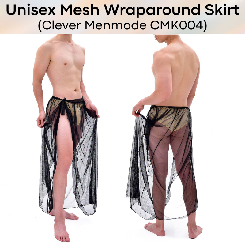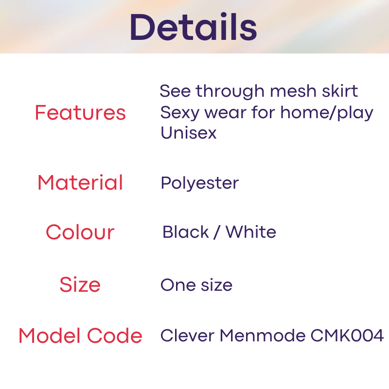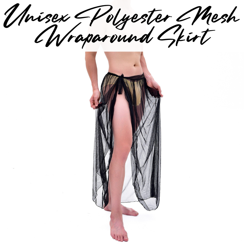 Made of polyester. Unisex. See through mesh skirt. Wraparound, suits all body types. Great for home/play.