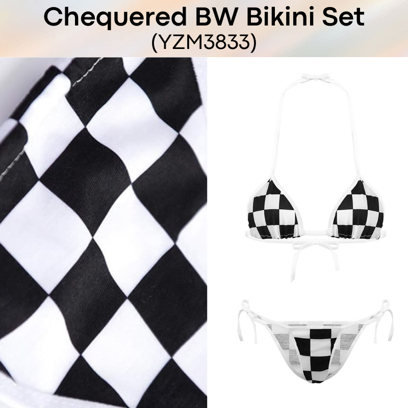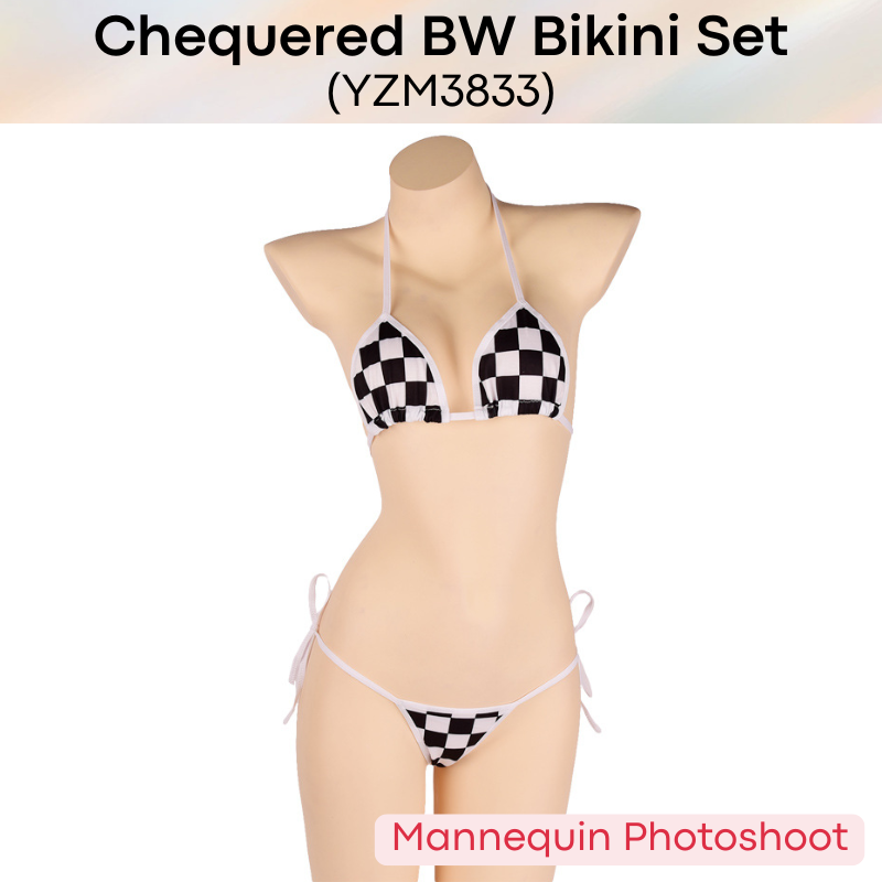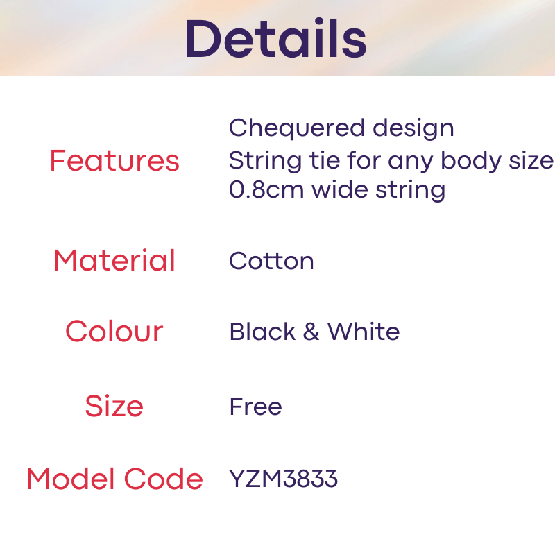 Made of cotton. Black and White chequered design. String tie, to fit any body sizes. Flat pouch brief/panty. Great for roleplay/bedroom.